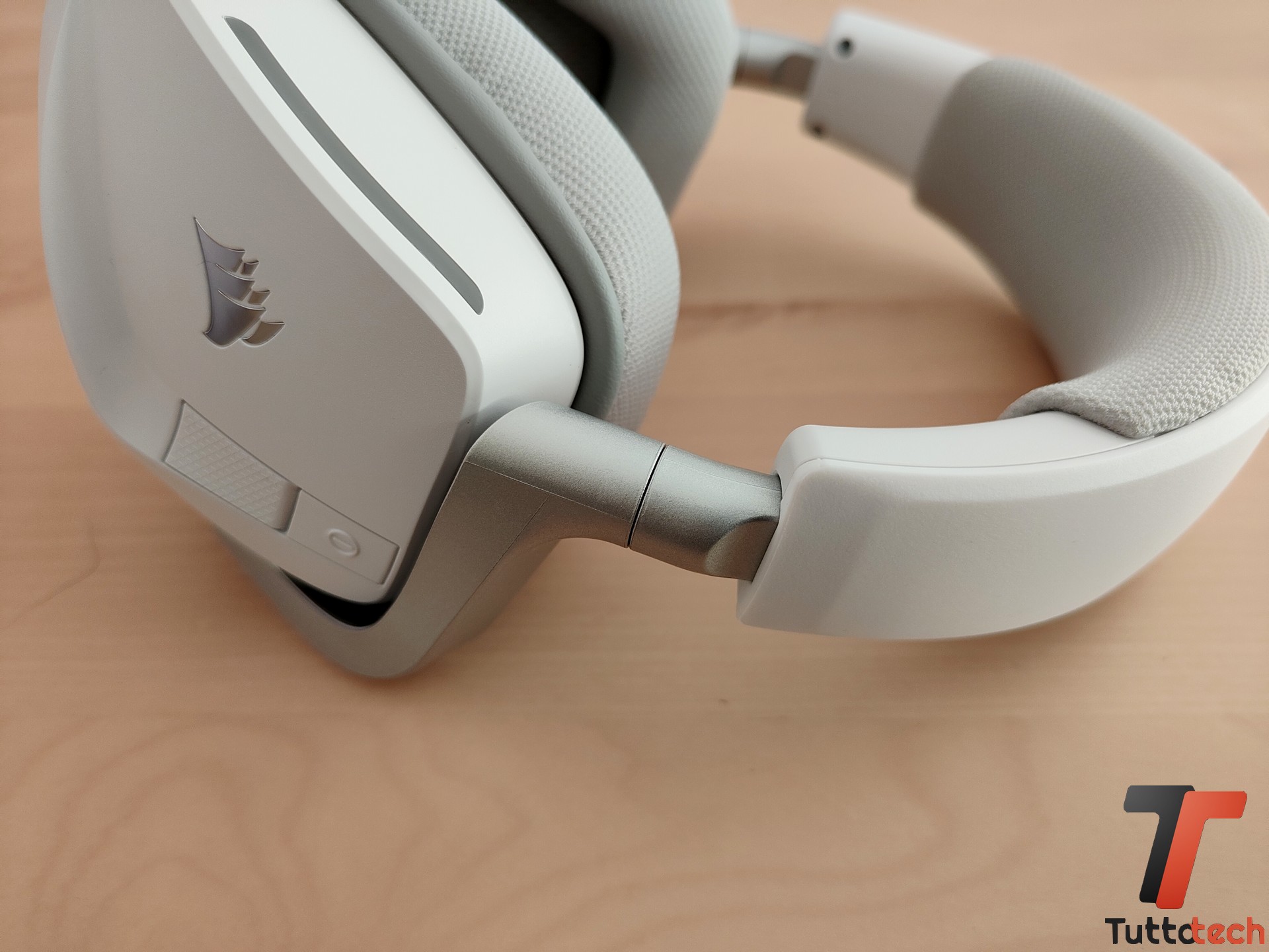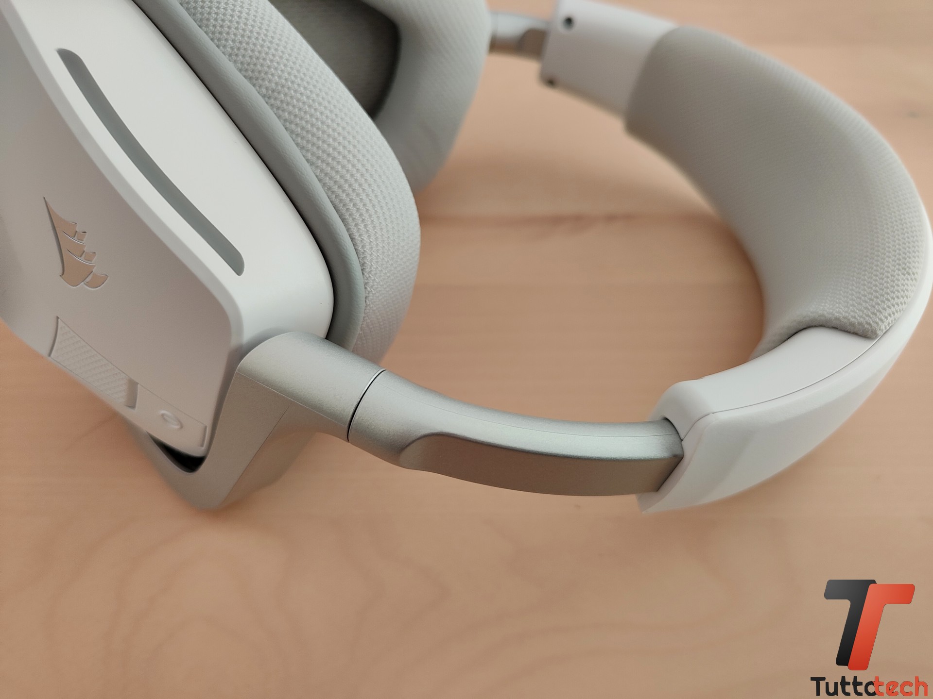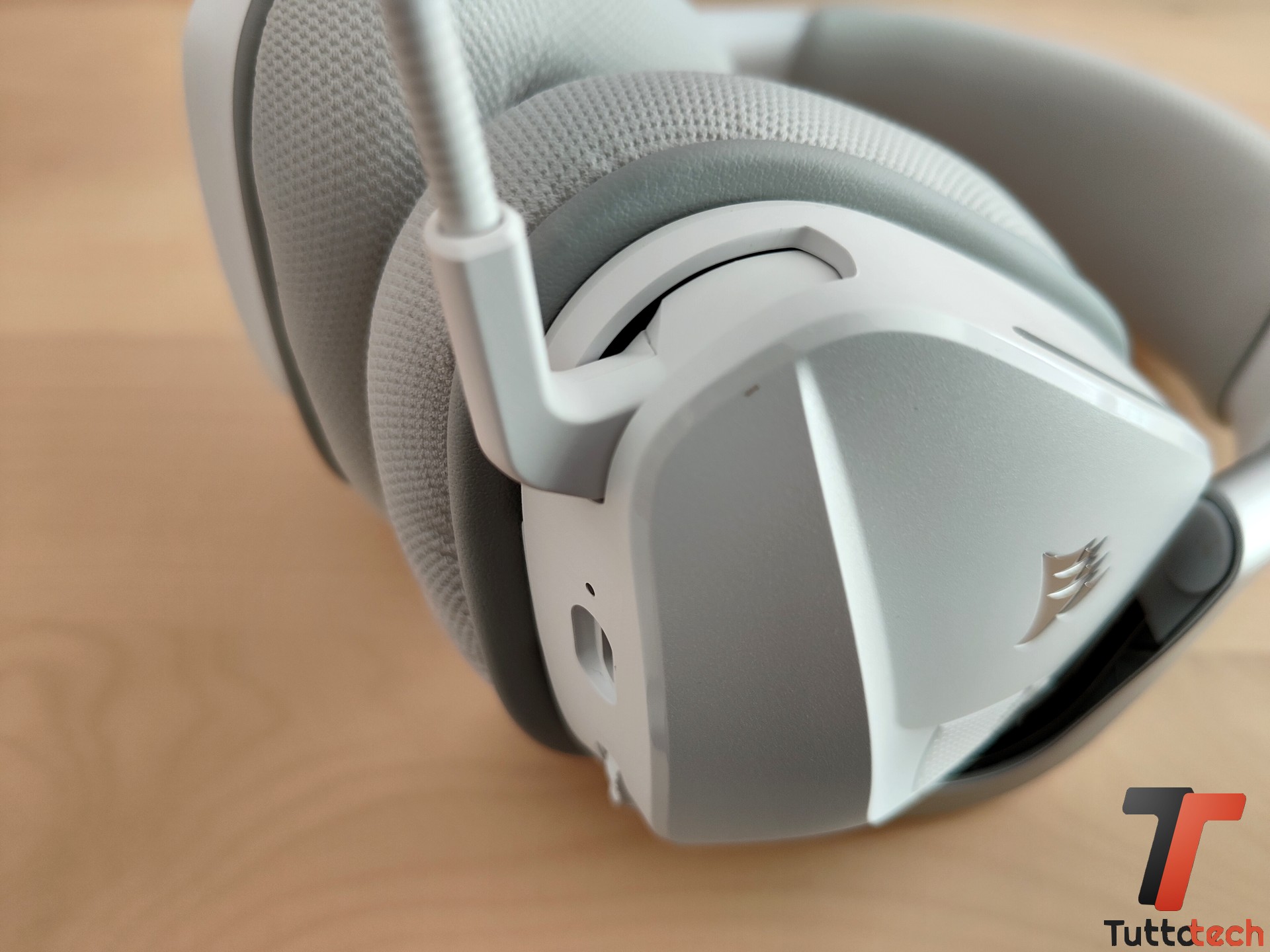 I padiglioni, così come l’archetto, si adattano bene alla nostra testa, integrando sul padiglione sinistro il microfono flessibile e tutti i controlli disponibili: il pulsante accensione, quello multifunzione, volume e porta USB-C per la ricarica e l’interfaccia col PC, inevitabile al primo utilizzo (possiamo personalizzare con iCUE).