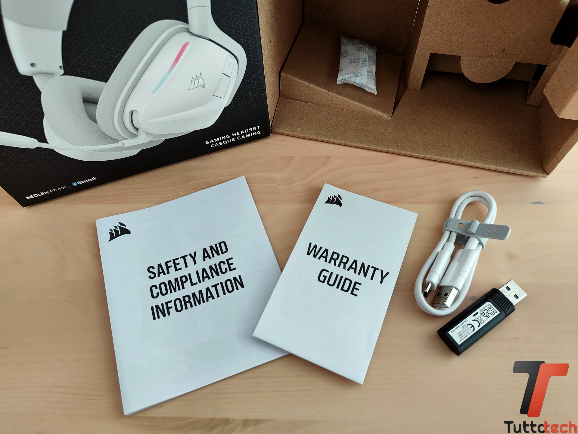 Prima di riassumere tutti i dati di queste Corsair VOID WIRELESS v2, segnaliamo che Corsair dichiara un’autonomia massima di 70 ore; non viene specificato in che ambito o modalità sia raggiungibile questo risultato, mentre va anche precisato che la periferica supporta la ricarica veloce ed è capace di garantire un’autonomia di 6 ore con una ricarica minima di appena 15 minuti (molto buono). In merito alla portata, il valore dichiarato è 50 piedi, ovvero poco più di 15 metri (che verificheremo).