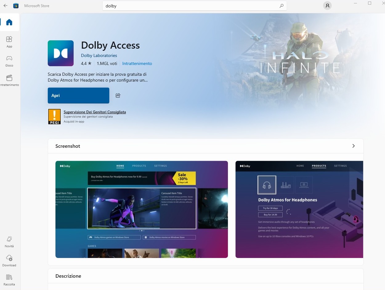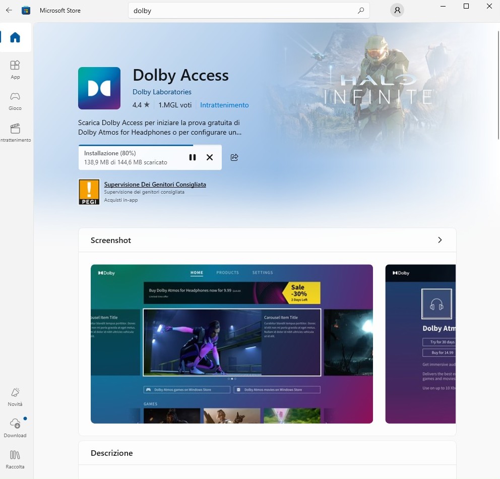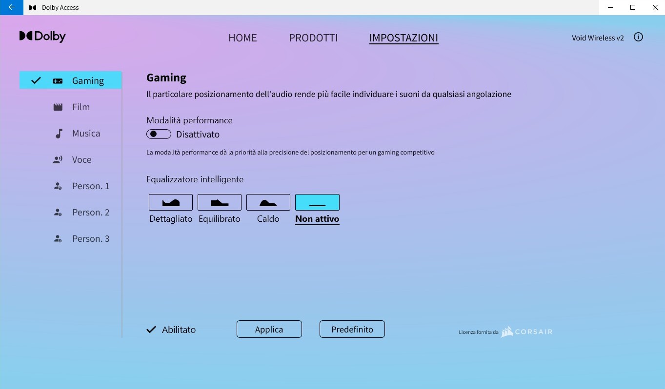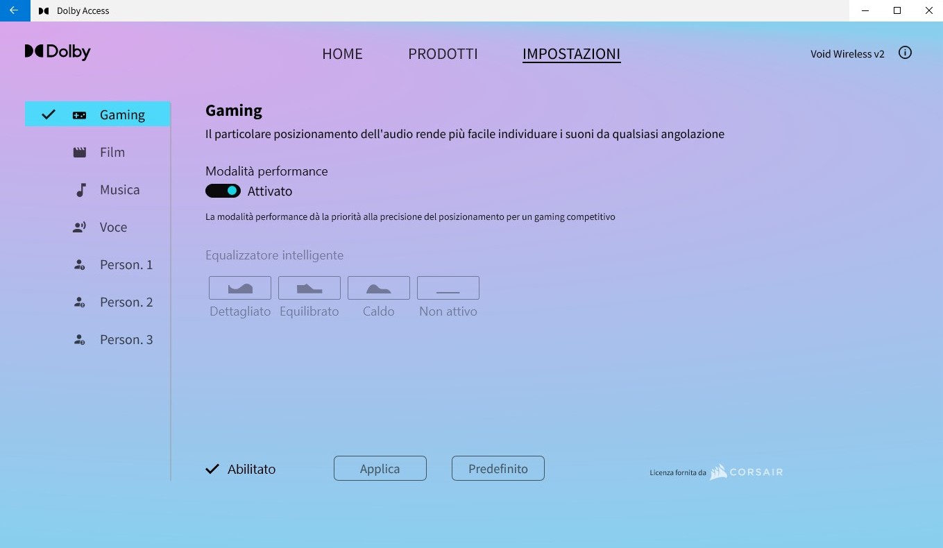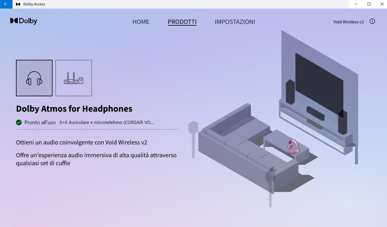Tra le cose da fare subito se acquistate le nuove Corsair VOID WIRELESS v2 c’è ovviamente la configurazione con iCUE, ma non solo. Essendo un headset Dolby Atmos, su PC non potete fare a meno di installare l’app Dolby Access (gratuita), in caso contrario non sfrutterete appieno le potenzialità di questo headset.