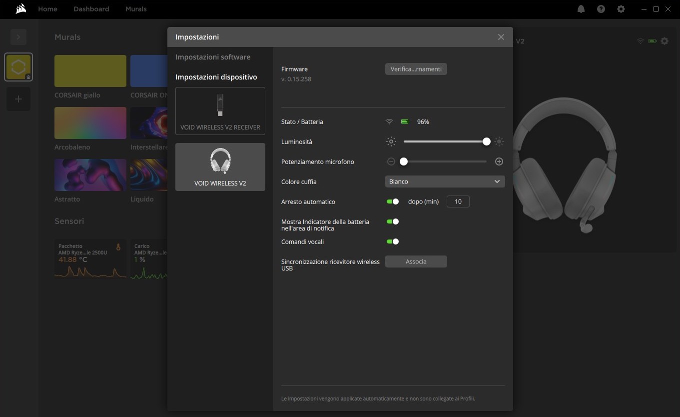 Collegando le cuffie al PC con il cavo USB in dotazione e il relativo ricevitore wireless, la prima volta Corsair iCUE andrà a riconoscere le periferiche, installandone i driver e proponendovi in caso di disponibilità l’ultimo firmware rilasciato. Fatto questo, potete decidere se proseguire con le varie personalizzazioni del caso o utilizzare subito le cuffie per testarne l’efficacia.