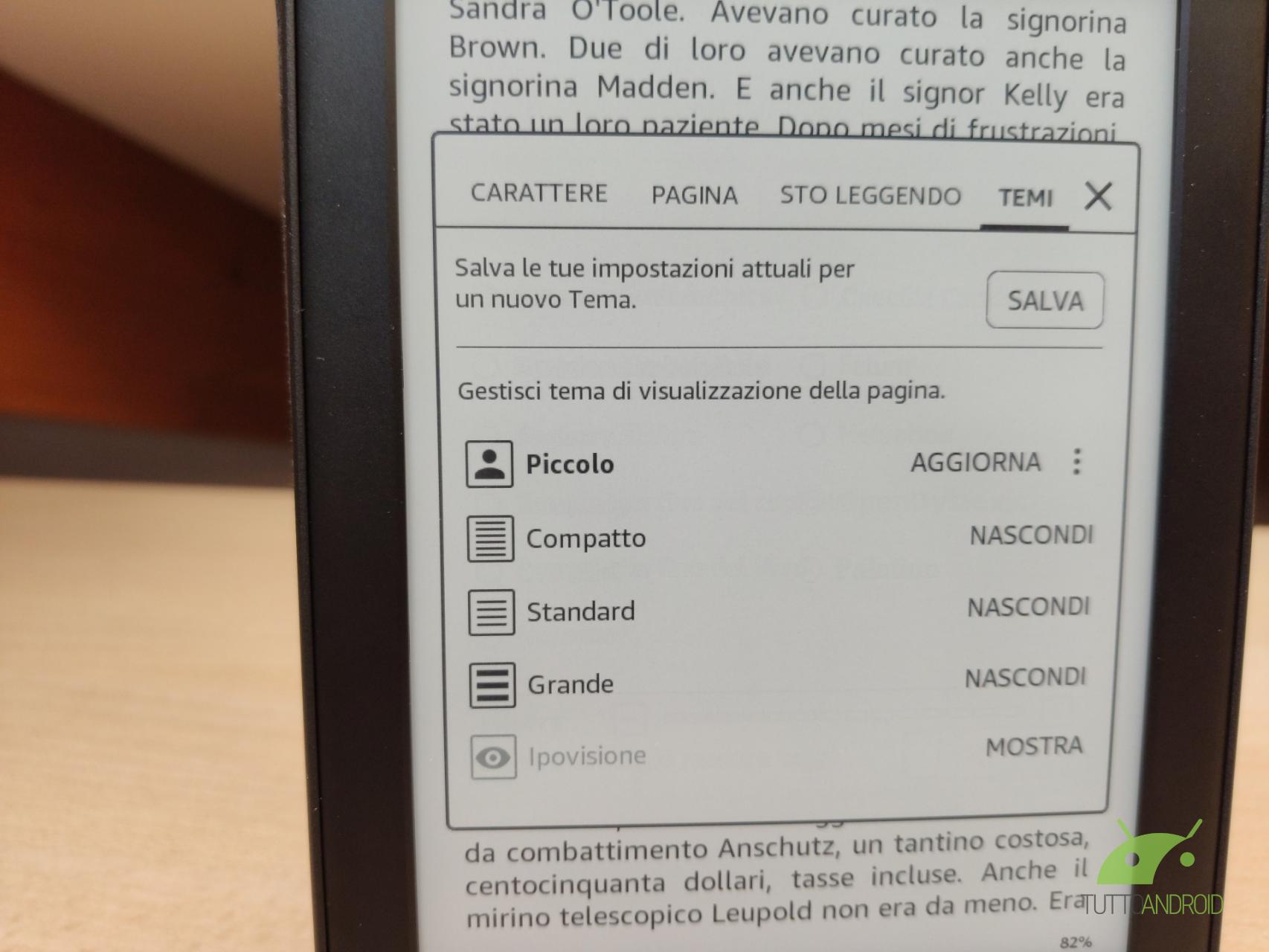A seguire è possibile scegliere cosa visualizzare nella parte inferiore dello schermo, con la possibilità di vedere la posizione nel libro, il numero di pagina, il tempo rimanente alla fine del capitolo, il tempo rimanente alla fine del libro o nessuna informazione. L’ultima scheda permette di salvare le impostazioni un nuovo tema, da riutilizzare in seguito, e di decidere quali temi mostrare.