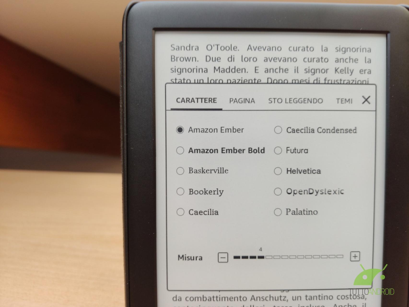 Gli utenti possono scegliere fra tre impostazioni predefinite o scegliere nel dettaglio i vari parametri. Toccando la voce “Impostazioni carattere e pagina” si apre una finestra con quattro schede. Nella prima è possibile selezionare il carattere, scegliendo tra i 10 disponibili, e le dimensioni, con 14 diverse misure. La seconda scheda consente di regolare l’interlinea, le dimensioni dei margini, l’orientamento della pagina e l’allineamento.