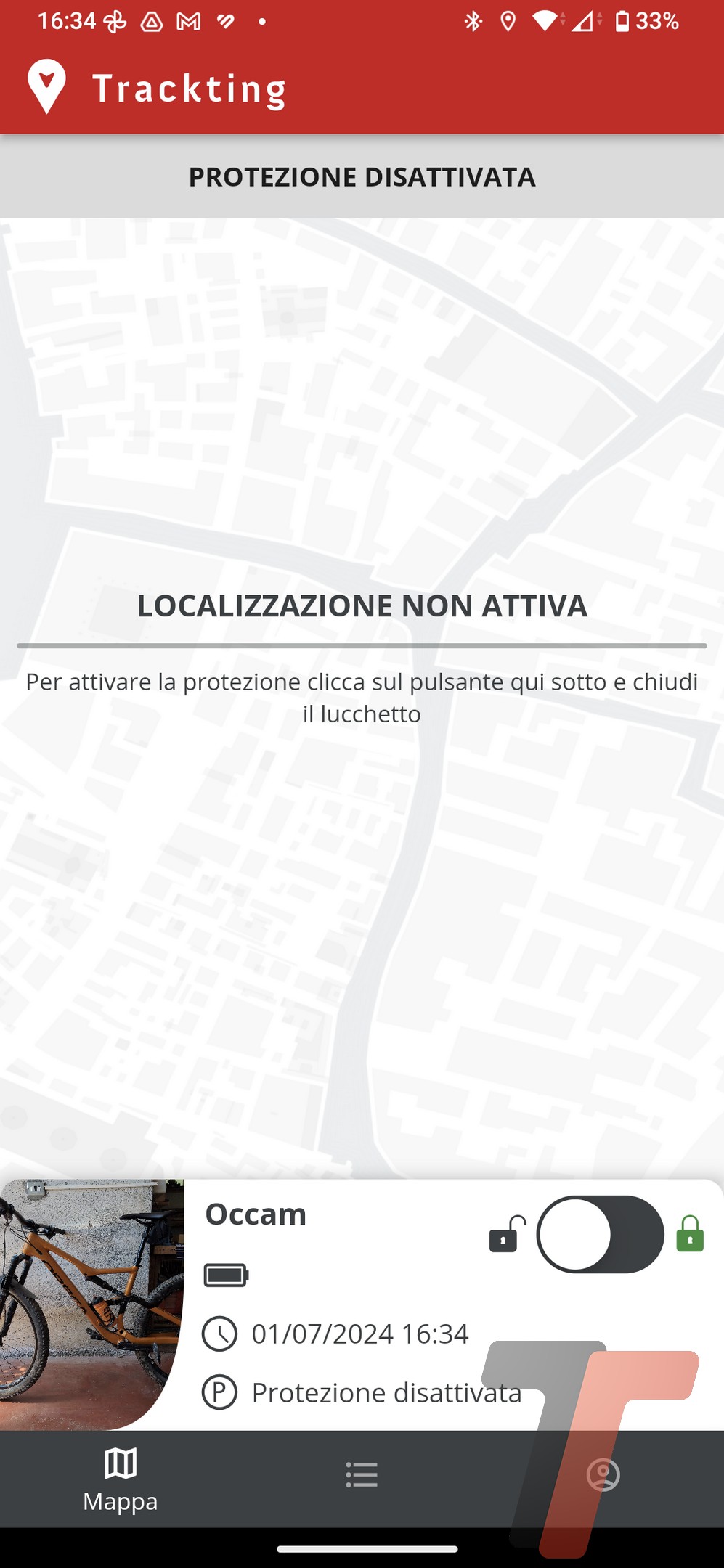 La schermata principale dell’app presenta un grande interruttore per attivare la modalità antifurto, quando questa non è attivata il T9 rimarrà in uno stato di ibernazione, in cui GPS e rete telefonica non saranno attivi, in questo modo la batteria potrà durare a lungo senza tracciare inutilmente i movimenti della bici. Il downside di questa scelta progettuale risulta nel fatto che per attivare l’antifurto è sempre necessario trovarsi nei pressi del T9, in modo che il dispositivo possa comunicare con lo smartphone via Bluetooth.