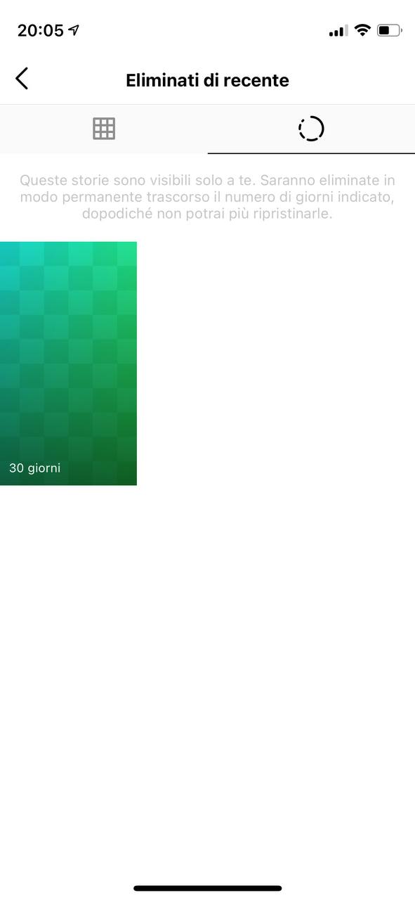 Al contrario dei post, le storie vengono conservate in questa cartella cestino per un periodo di 24 ore invece di 30 giorni. Una volta ripristinate, le storie hanno sempre una validità di 24 ore, trascorse le quali, se non risposte nella sezione Archivio, non sarà più possibile recuperarle.