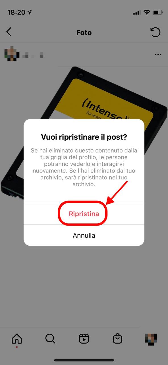 - Premiamo su Ripristina per recuperare il post cancellato su Instagram: un pop-up ci chiederà di confermare la nostra scelta.