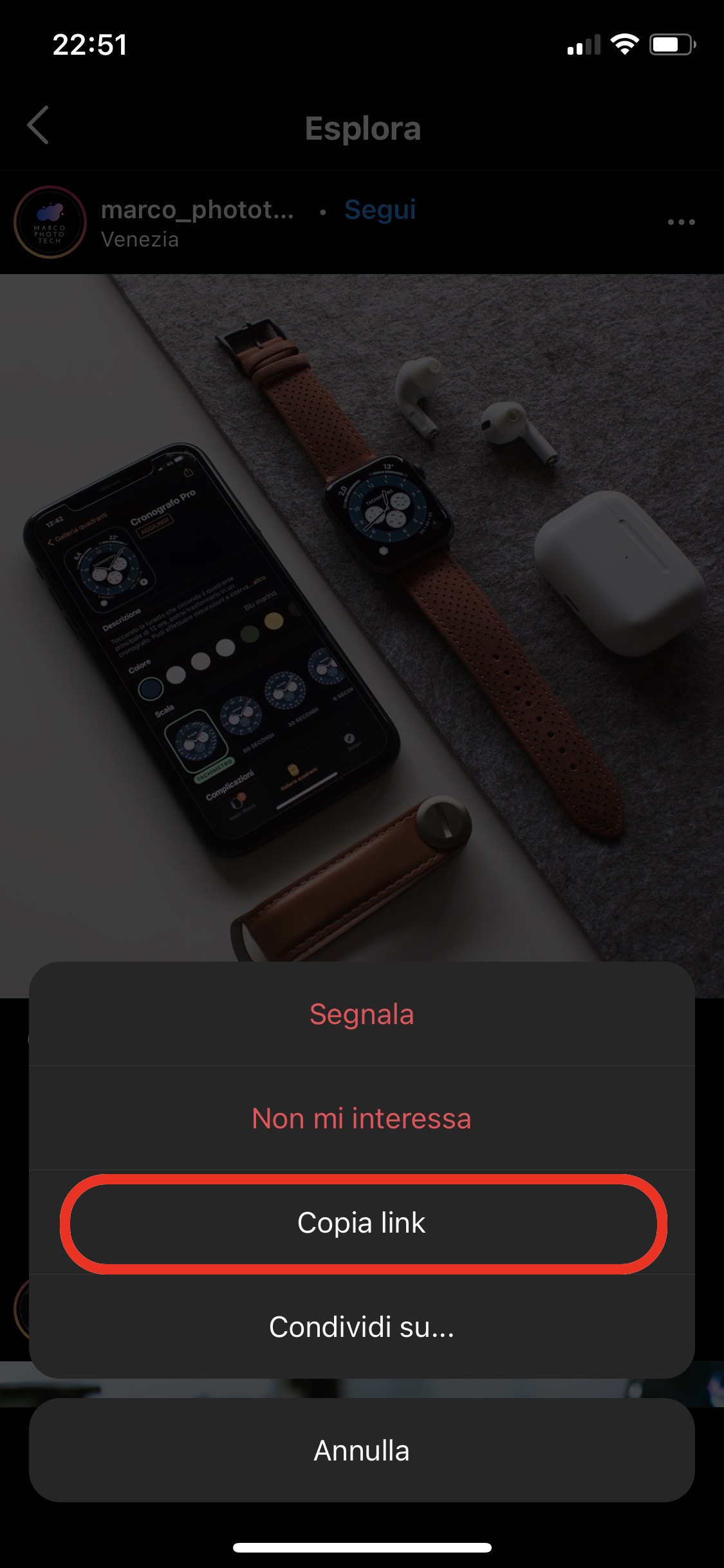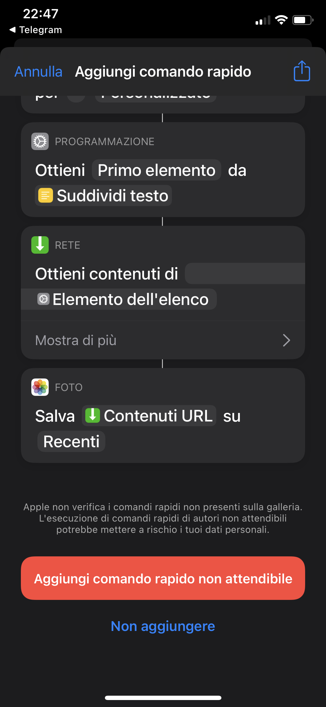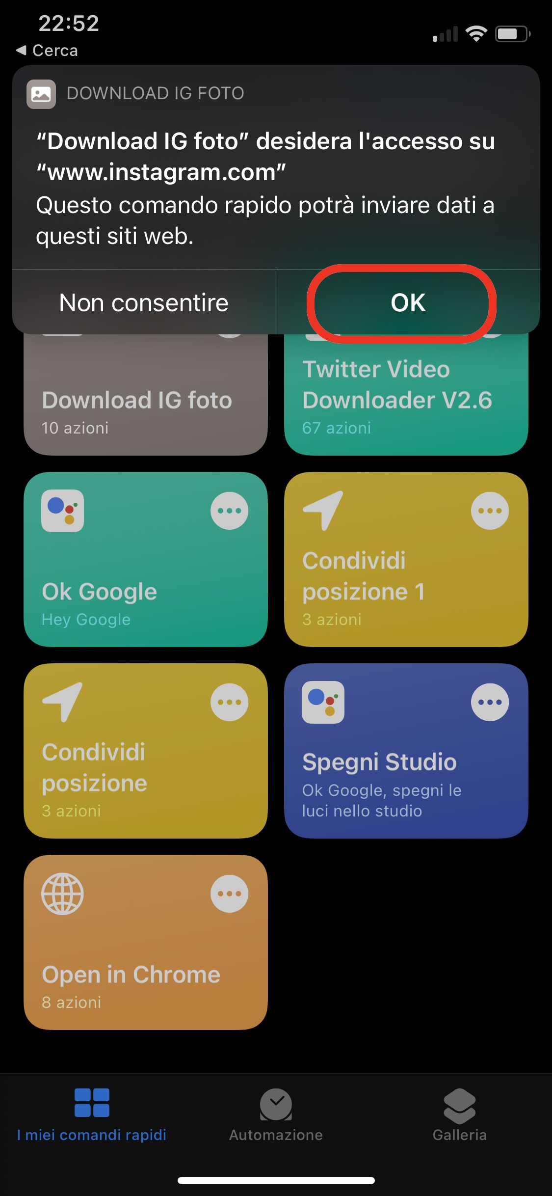 Ora che abbiamo installato il comando rapido tutto ciò che ci rimane da fare è aprire l’app di Instagram, individuare la foto che ci interessa scaricare e cliccare sui tre pallini in alto a destra, quindi selezionare Copia link dal menu. Fatto questo, apriamo Comandi rapidi e clicchiamo sul comando Download IG foto: potrebbe essere visualizzato un pop-up che richiedere i permessi di accesso, premete Ok. Una volta completata questa operazione, avrete la foto Instagram salvata nel rullino foto.