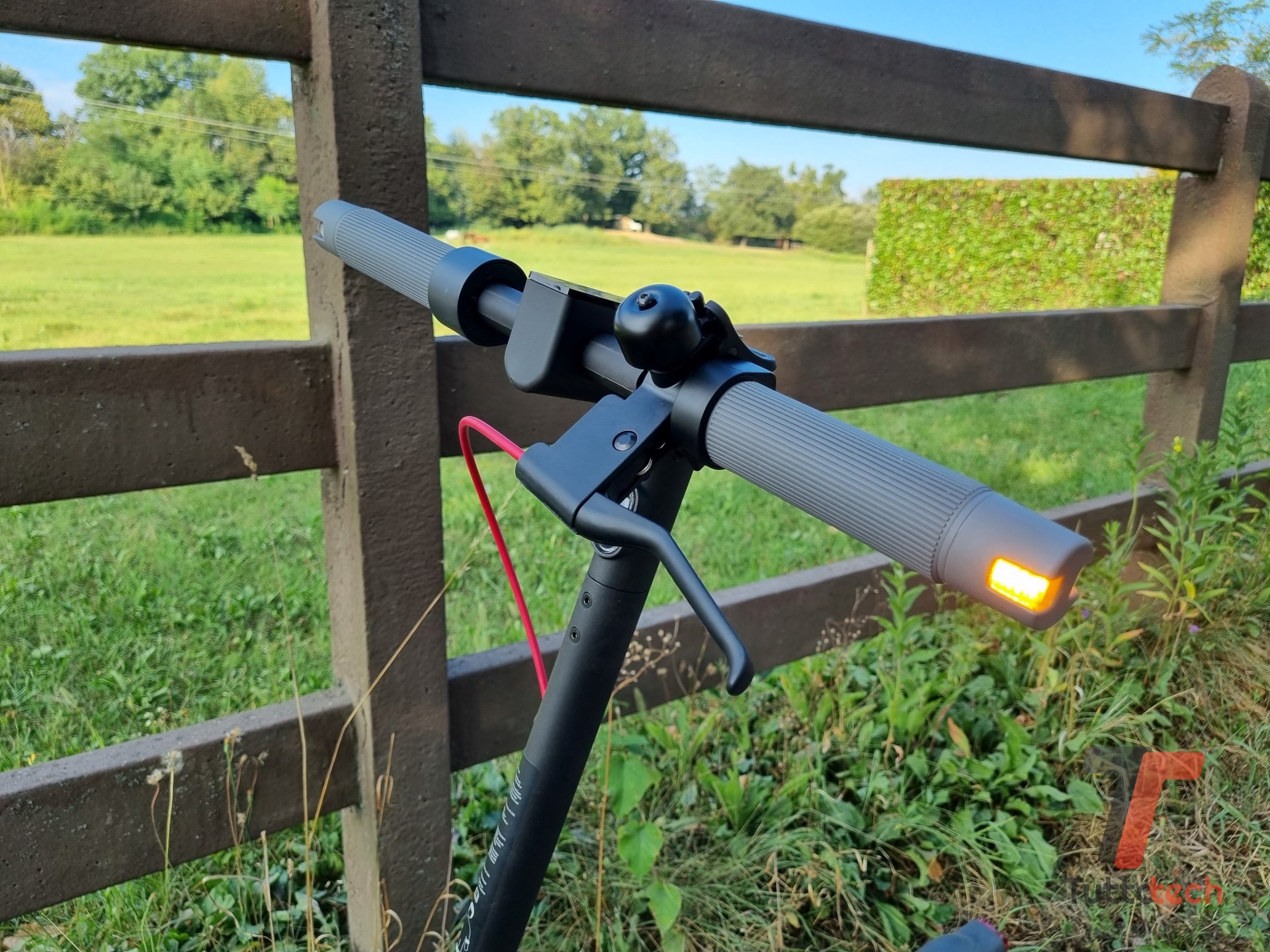 Il design frontale a “T” ha un aspetto minimalista e non differisce più di tanto da quello visto sugli altri modelli Xiaomi. Abbiamo un’impugnatura antiscivolo in silicone, affiancata dalle comode frecce direzionali utili per segnalare le svolte senza doversi necessariamente sbracciare. Lo schermo centrale offre tutto quello che serve con un colpo d’occhio: indica la velocità attuale, la modalità attiva (Camminata, Standard o Sport, ma di questo parleremo più avanti), il livello di carica della batteria (tramite cinque tacche bianche, per quella precisa occorre usare l’app) e la connettività Bluetooth, e integra varie spie (per le frecce, il blocco, eventuali problemi o l’avviso per la manutenzione programmata degli pneumatici). Più in basso c’è il pulsante principale: per accendere o spegnere il monopattino basta tenerlo premuto per un istante, ma svolge anche altri compiti; una pressione singola accende (o spegne) le luci, una doppia pressione rapida procede al cambio di modalità di guida. A completare il “volante” troviamo ovviamente l’acceleratore (sul lato destro), due pulsanti fisici per le frecce e il pratico campanello, la cui levetta risulta utile anche per la portabilità.