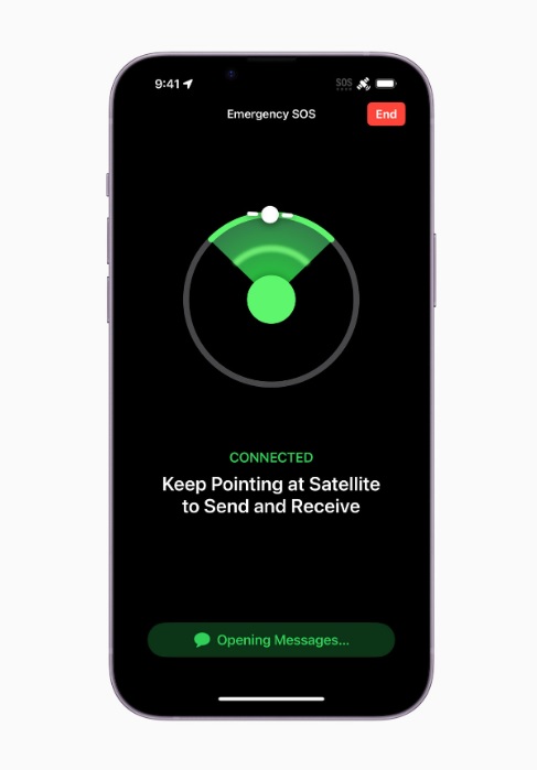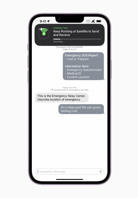 Nel comunicato stampa Apple spiega che gli iPhone 14 saranno in grado di connettersi direttamente ai satelliti Globalstar per consentire agli utenti di inviare messaggi di testo e la propria posizione ai servizi di emergenza, guidandoli nel puntare il proprio iPhone verso un satellite.