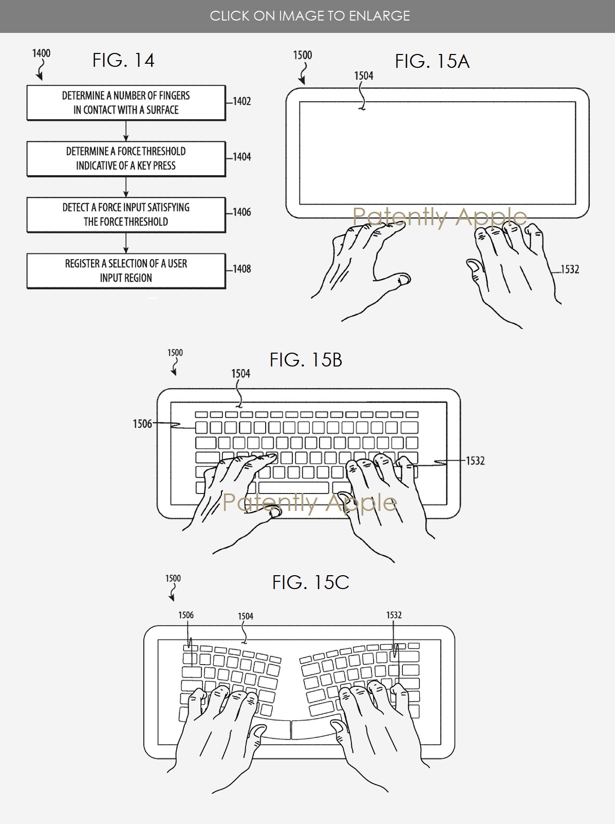 Le immagini del brevetto di Apple mostrano esempi di rilevamento della pressione di un tasto e di generazione di zone di input in base alle interazioni dell’utente. Non manca neppure la possibilità di scegliere tra una tastiera classica e una con suddivisione ergonomica dei “tasti”. Tra gli esempi concreti, le immagini di Apple mostrano proprio un notebook, dunque un MacBook, come quello descritto poc’anzi: in un caso la superficie di input viene usata per i controlli della riproduzione musicale, nell’altro in guisa di tastiera e trackpad durante la navigazione sul web. A seguire una simile “tastiera senza tasti” viene mostrata in abbinamento ad un computer all-in-one come un iMac e ad un iPad.