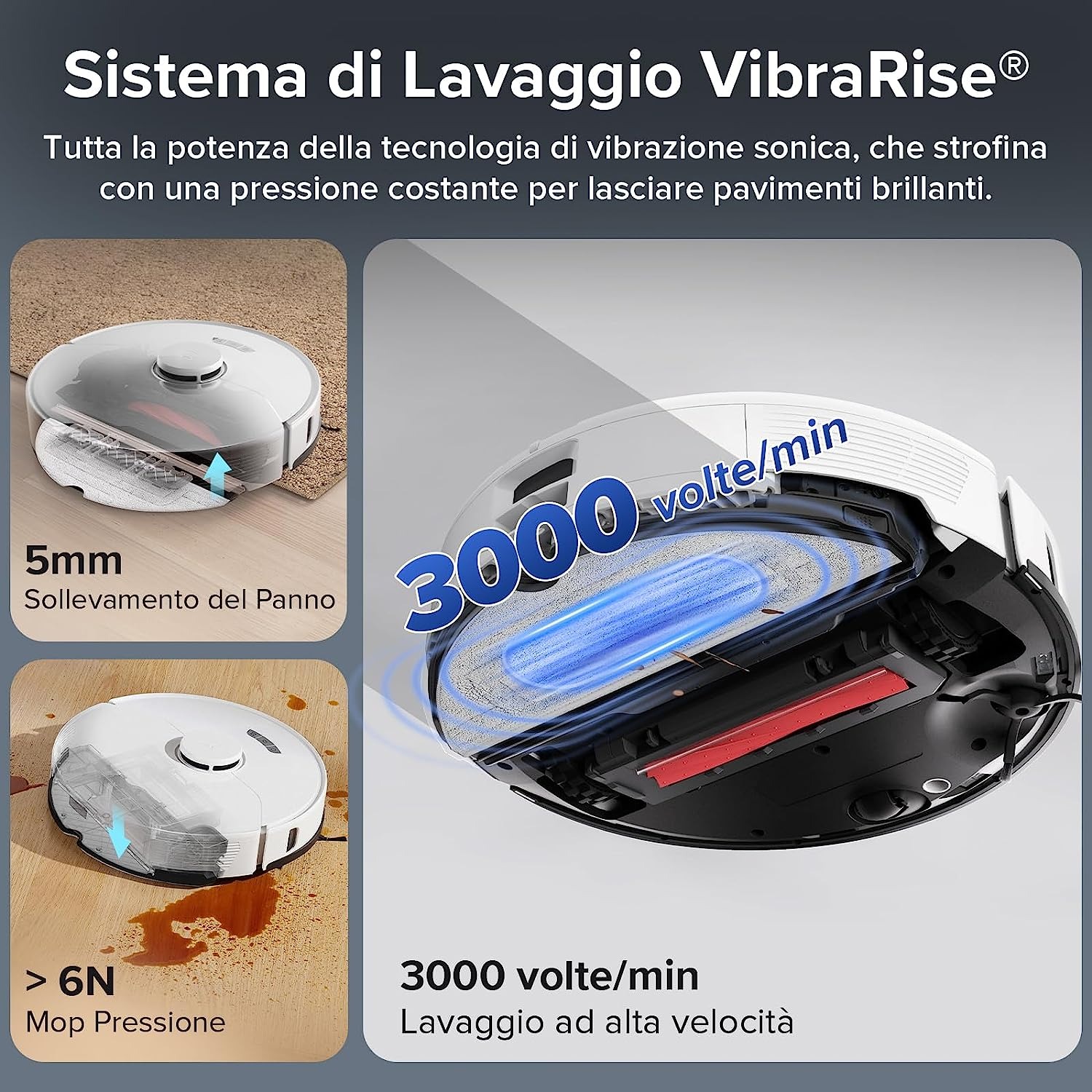 Il sistema VibraRise utilizza la potenza della tecnologia a vibrazione sonica per strofinare il pavimento con una pressione costante, rimuovendo le macchie più ostinate per lasciare pavimenti più puliti. E il panno può essere sollevato di 5 millimetri per evitare di bagnare i tappeti e superfici delicate.