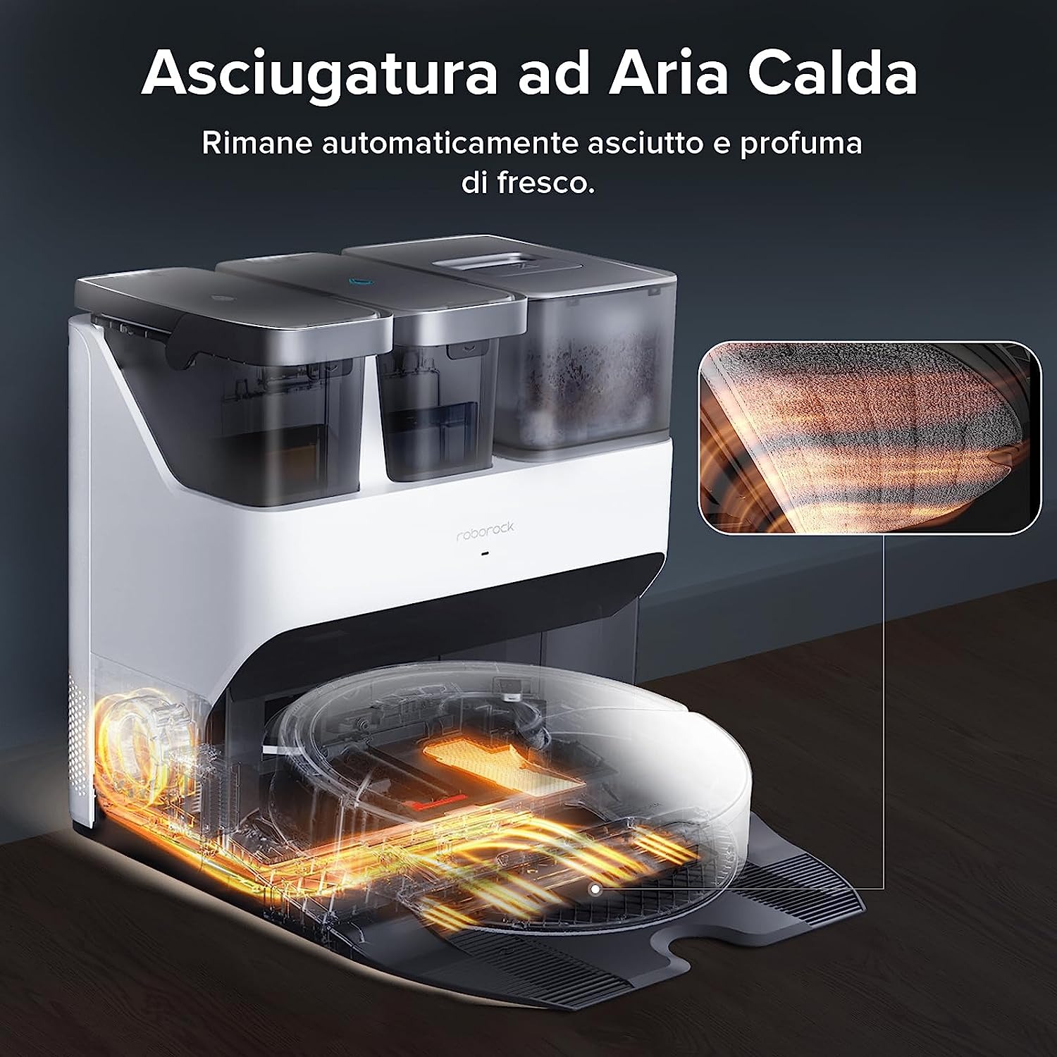 La base RockDock Ultra è tra le più evolute presenti sul mercato: pulisce il panno di lavaggio, per consentire una igiene migliore, raccoglie automaticamente la polvere aspirata dal robot, riempie il serbatoio dell’acqua del robot, asciuga il panno e si pulisce da sola, oltre a ricaricare il robot in attesa della pulizia successiva. Il sacco per la polvere può contenere lo sporco di quasi due mesi e non ci saranno odori sgradevoli dovuti ai panni umidi, grazie alla base asciugante.