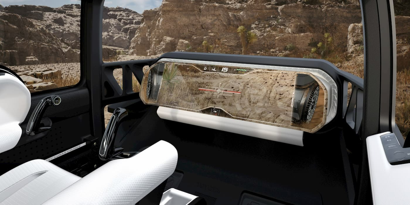 L’aspetto generale ricorda molto quello squadrato e massiccio del vecchio FJ40, con proporzioni simili, fari tondi e griglia frontale verticale. Non mancano però elementi di rottura come la fascia anteriore che integra telecamere e sensori, i cerchi carenati aerodinamici e la carrozzeria semi-trasparente. Gli interni sono ancora più futuristici, con un grande parabrezza panoramico, console di controllo minimal e sedili avvolgenti.