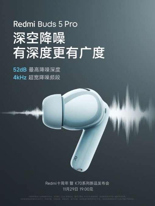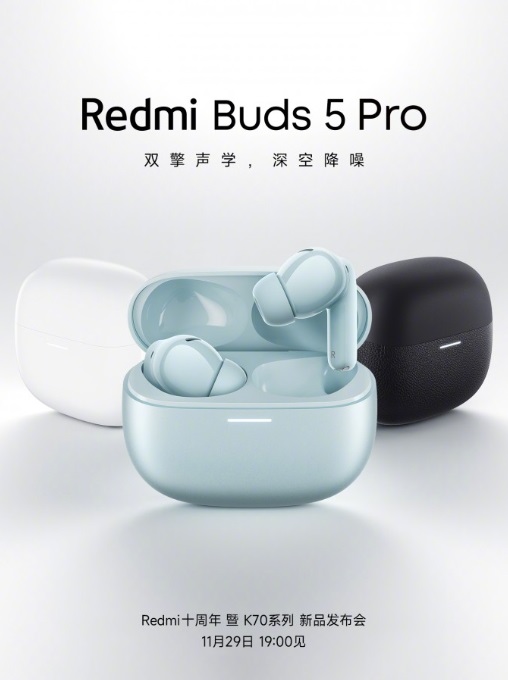 Le cuffie true wireless Redmi Buds 5 Pro arriveranno nei colori nero, bianco e blu con design in-ear. I materiali di marketing dichiarano una riduzione del rumore fino a 52 dB e driver dinamici con tweeter rivestiti in ceramica da 10 mm, oltre a woofer placcati in titanio da 11 mm.