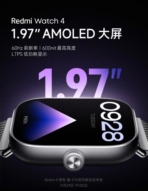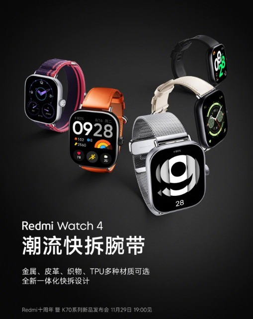 Secondo le immagini promozionali trapelate Redmi Watch 4 è disponibile con una varietà di cinturini in silicone, acciaio inossidabile, pelle e tessuto, inoltre è il primo Redmi Watch con cassa in alluminio.