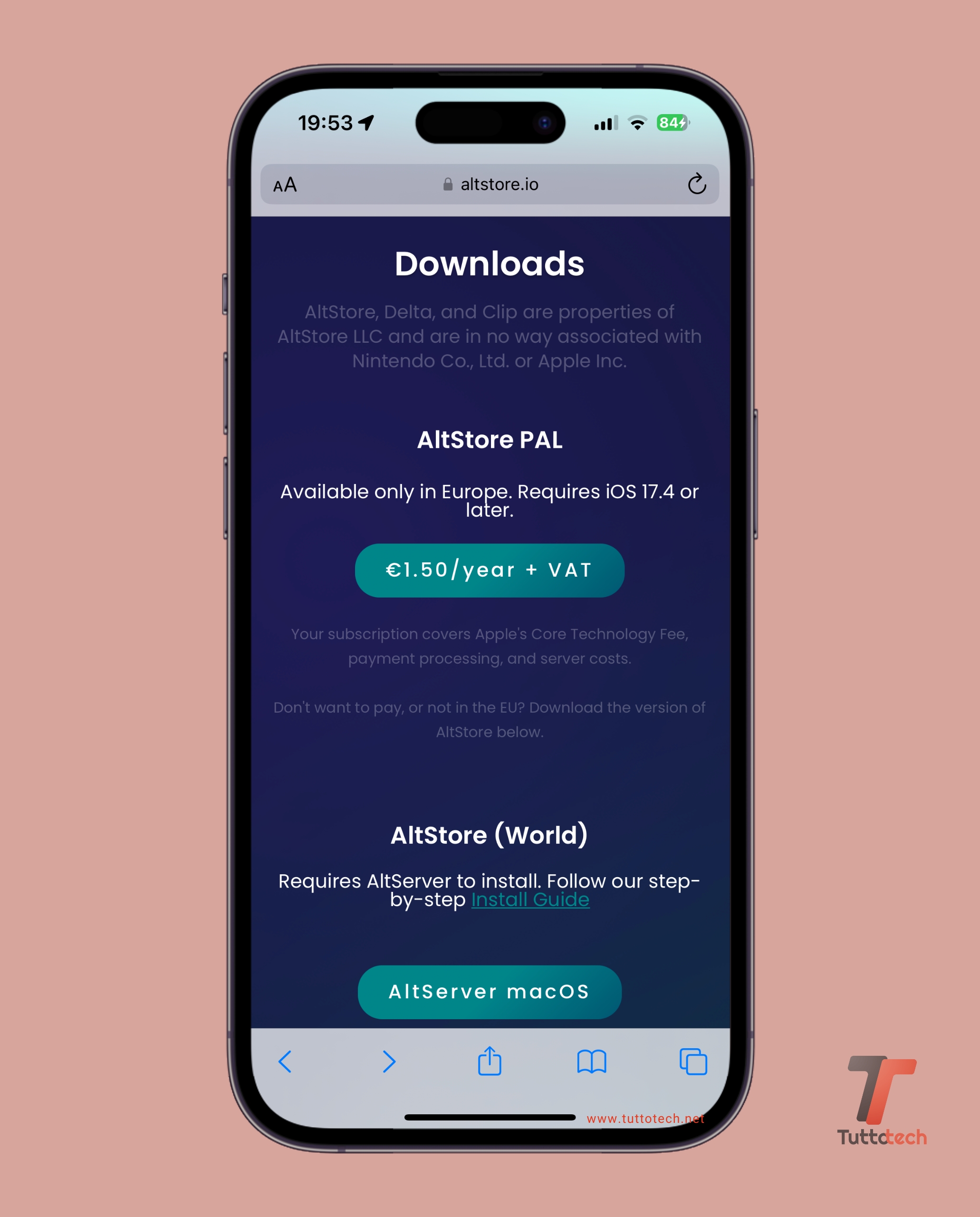 Gli utenti europei che eseguono iOS 17.4 o iPadOS 17.4 e versioni successive dei sistemi operativi sui loro iPhone e iPad possono installare in maniera molto semplice il nuovo AltStore PAL, visitando la sezione download del sito web ufficiale di AltStore ed effettuando un tap sul pulsante che recita “€1.50/year + VAT”.