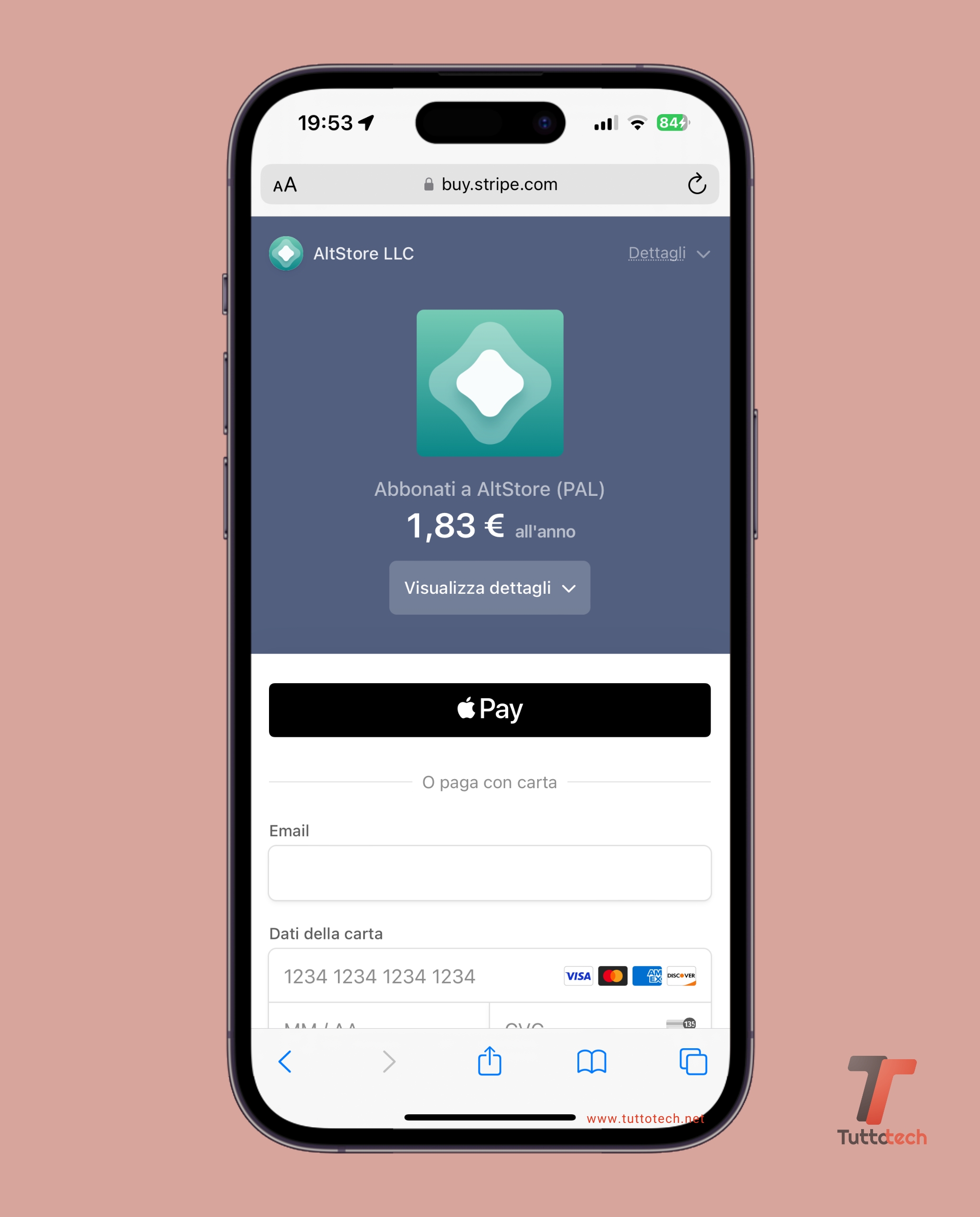 A quel punto, l’utente verrà reindirizzato a una pagina di pagamento (sul portale stripe.com) che serve per inserire i dati e abbonarsi al servizio. Questa prassi è necessaria per potere procedere con l’effettiva installazione.