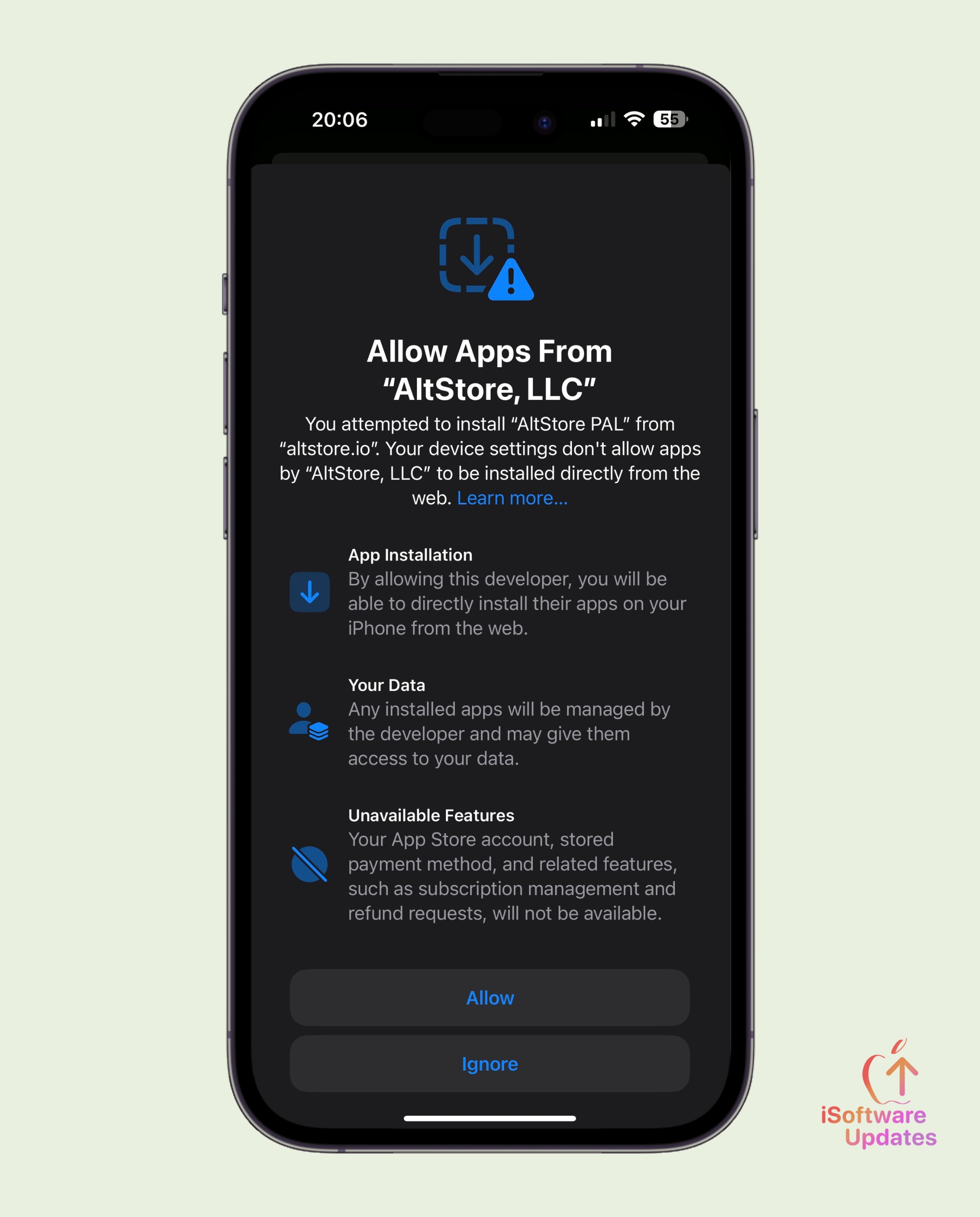 A quel punto, verrà mostrata una schermata (informativa) di sistema che chiederà all’utente di consentire l’installazione di app (nello specifico di AltStore PAL) dal sito dello sviluppatore (in questo caso altstore.io). Una seconda schermata chiederà conferma per l’effettiva installazione (via @iSWUpdates su X).
