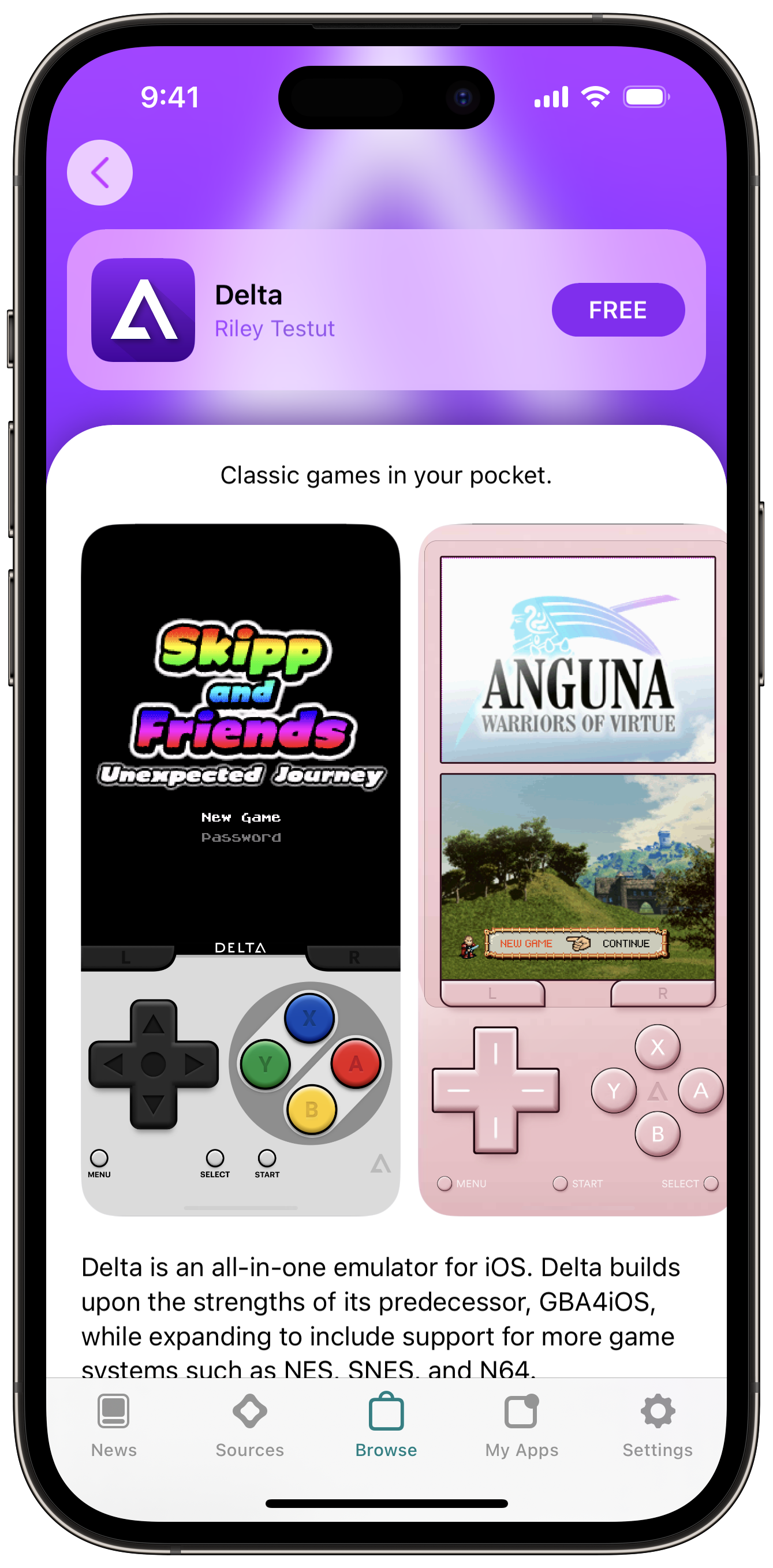 - Delta (app gratuita) è un emulatore di alcune storiche console Nintendo (NES, SNES, N64) che consente di giocare a vecchi giochi direttamente su iPhone e iPad; chiunque installa quest’app, infatti, può caricare ROM dei giochi attraverso iCloud Drive o dalla cartella Download del dispositivo. I controlli sono a schermo ma è anche possibile collegare un controller esterno.