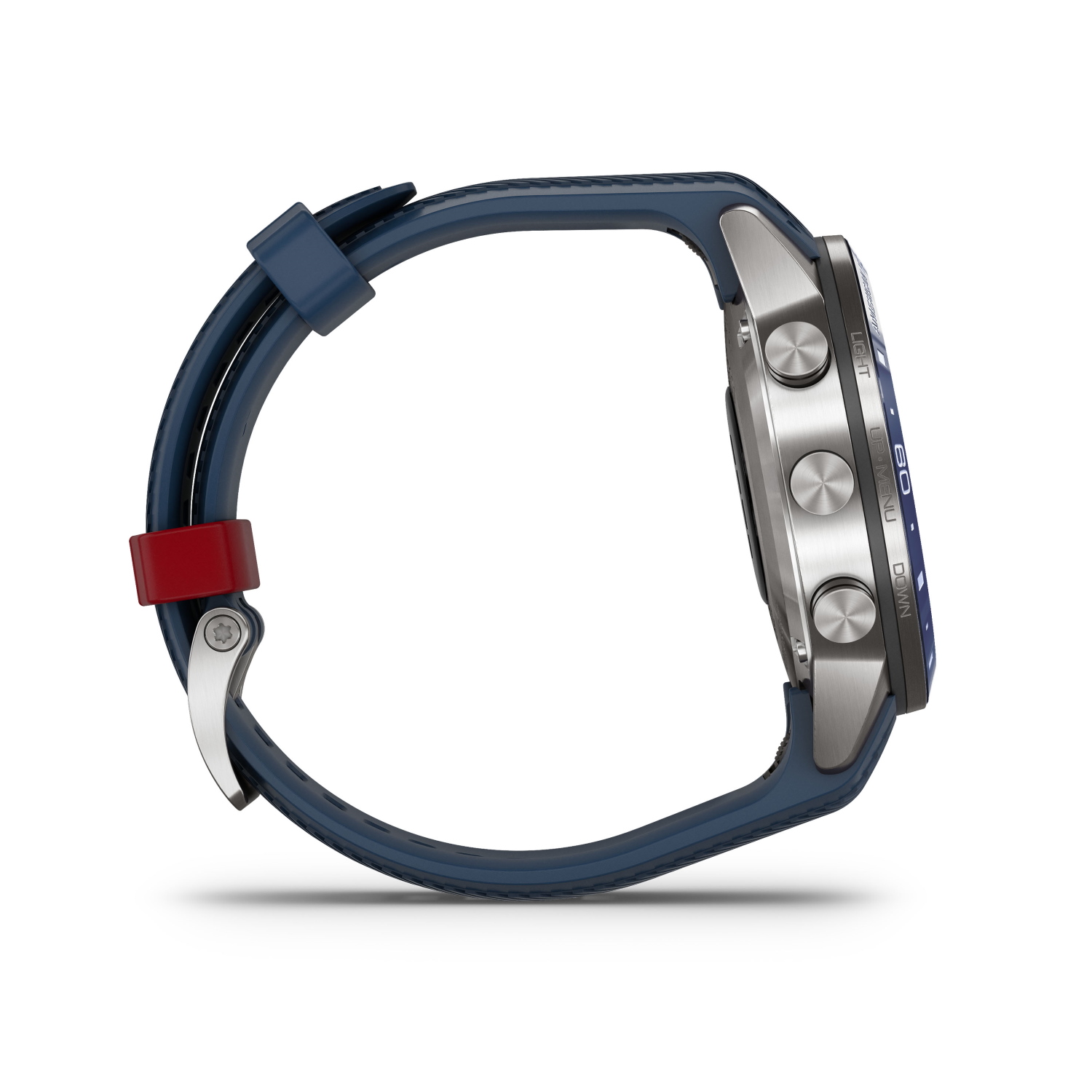 Il cinturino in silicone ha colori a contrasto: Blue Navy per il cinturino e rosso per il passante, come i colori ufficiali del team American Magic (il cui nome è inciso sulla lunetta in titanio e rivestita in ceramica a specchio).