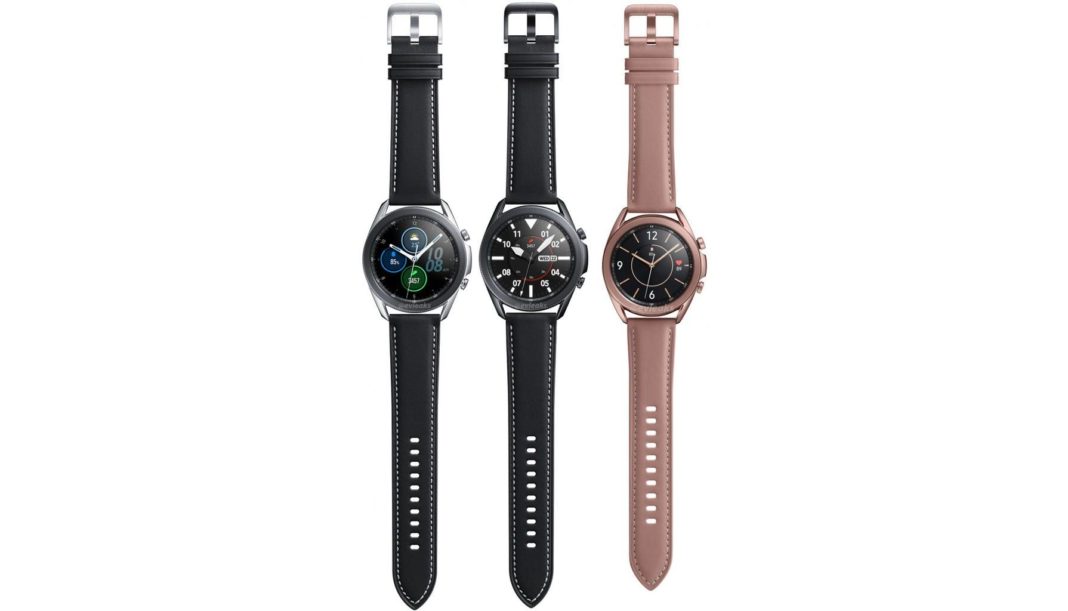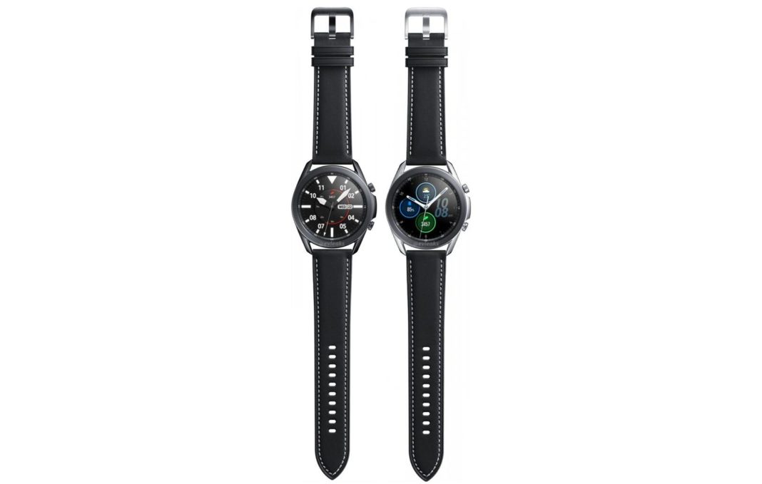 Da questa immagine è possibile notare Samsung Galaxy Watch 3 nella variante da 45 mm – ricordiamo che il wearable è atteso anche con cassa da 41 mm con display da 1,2 pollici – con i due tasti laterali incastonati nella cassa circolare.