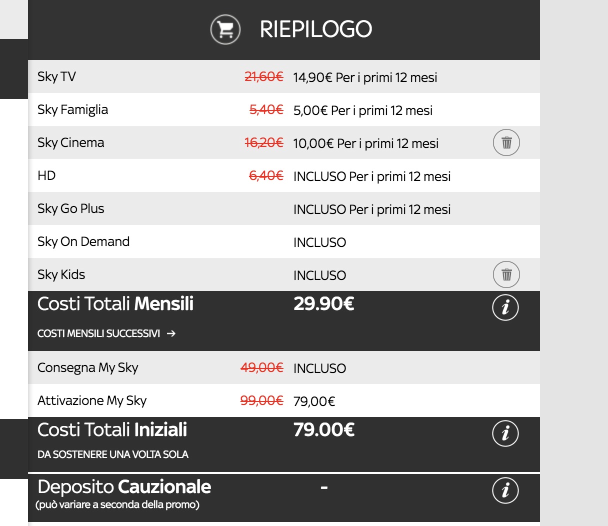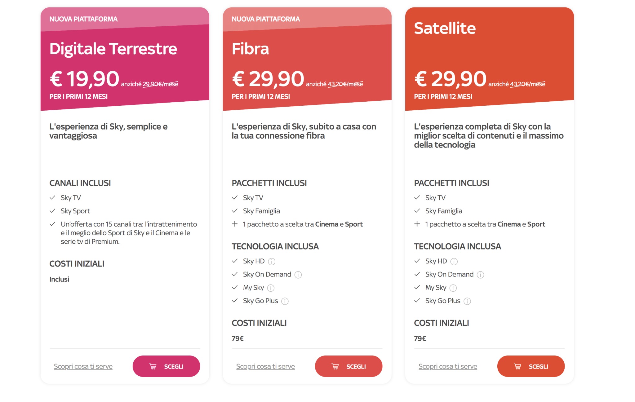 Qui sotto vi lasciamo una tabella riassuntiva di tutti i pacchetti, con il costo relativo, per abbonarsi a Sky.