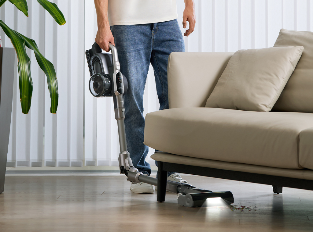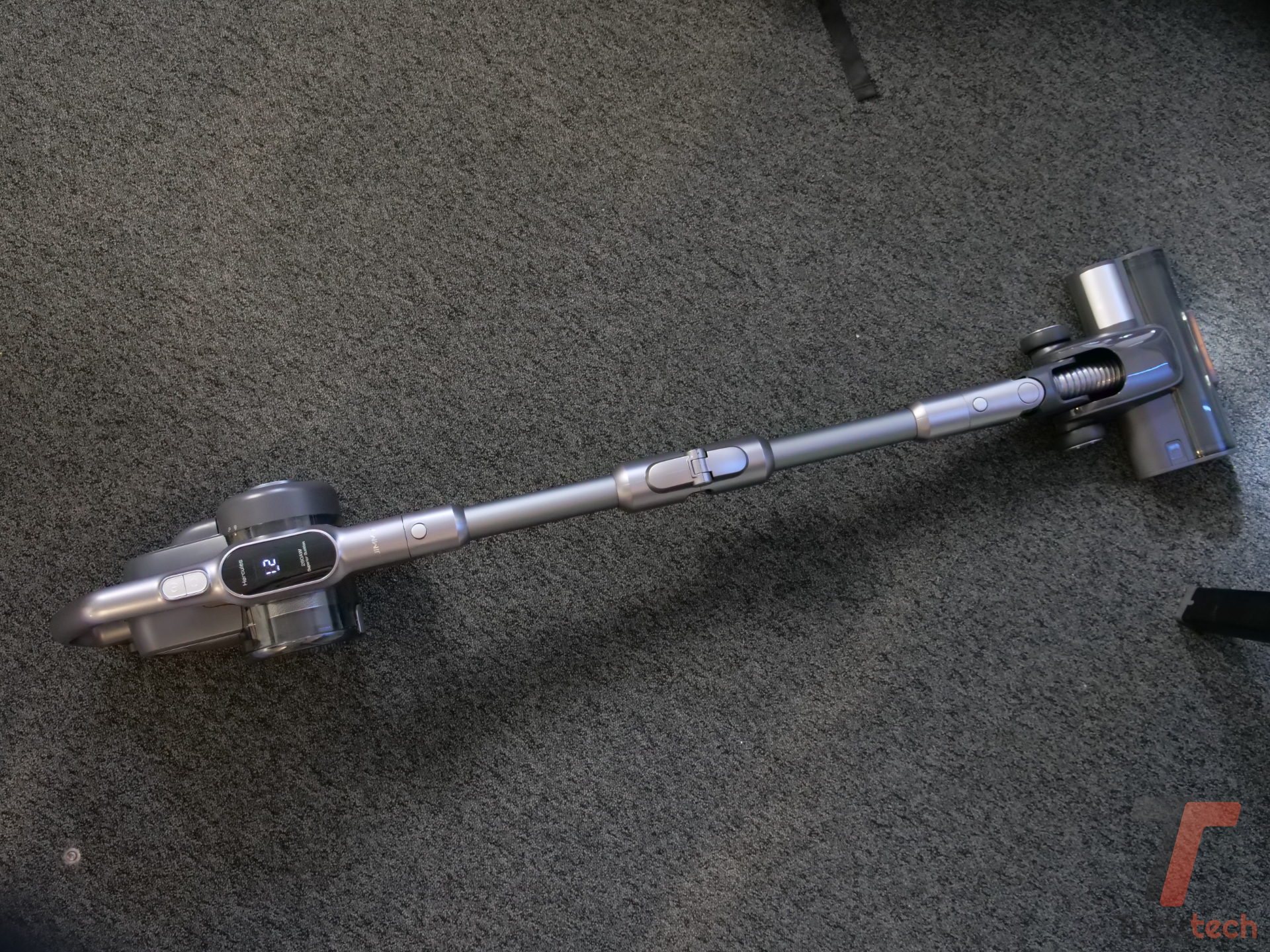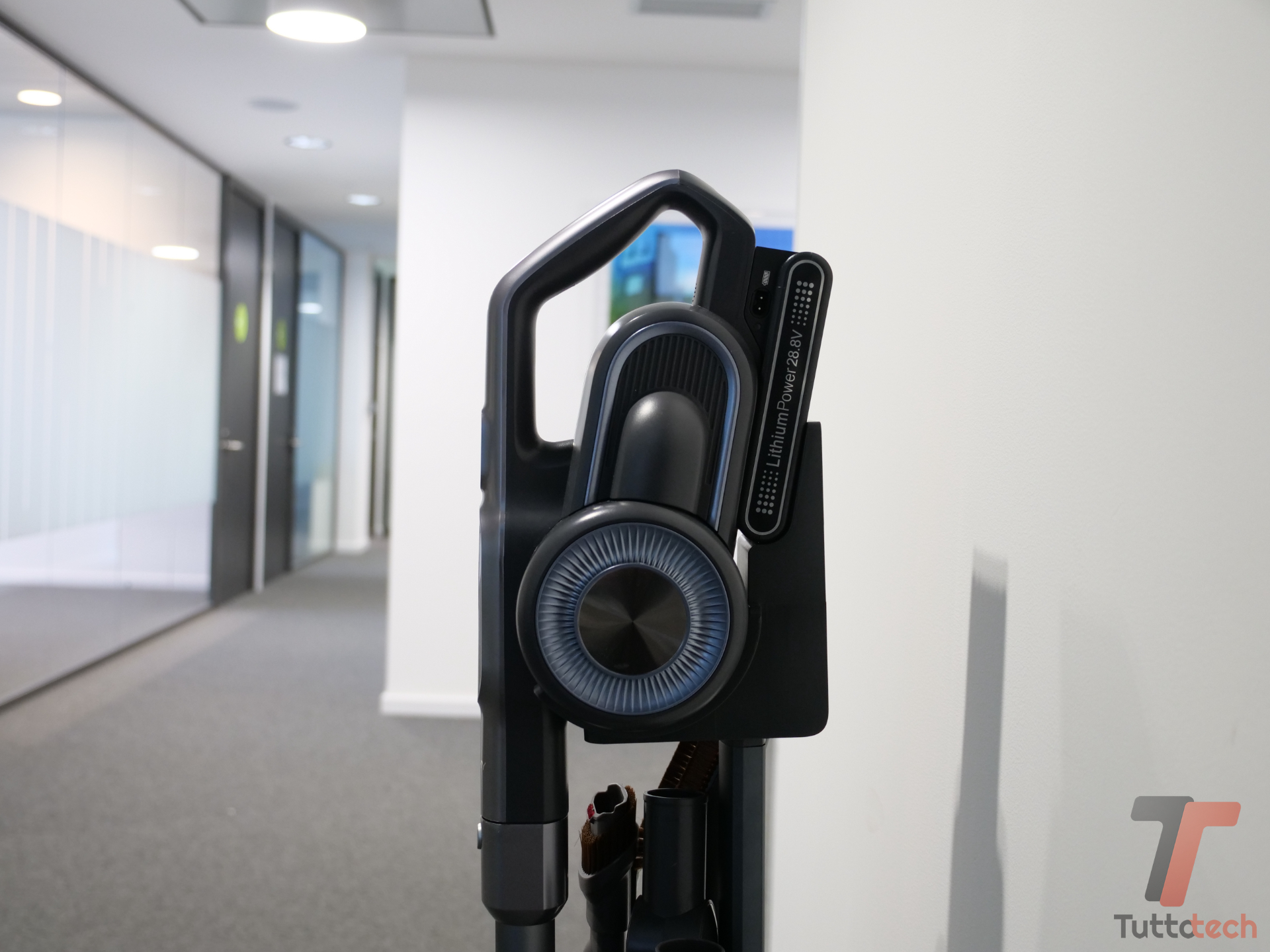 Il design è stato chiaramente studiato per l’uso domestico intensivo: dimensioni compatte e un’impugnatura ergonomica che ci ha consentito di effettuare lunghe sessioni di pulizia senza affaticamento. L’interfaccia utente è ben integrata nel corpo macchina, con un display LED visibile anche sotto la luce diretta, che offre informazioni sempre chiare sull’autonomia residua, sulla modalità di aspirazione attiva e sul livello di sporco rilevato.