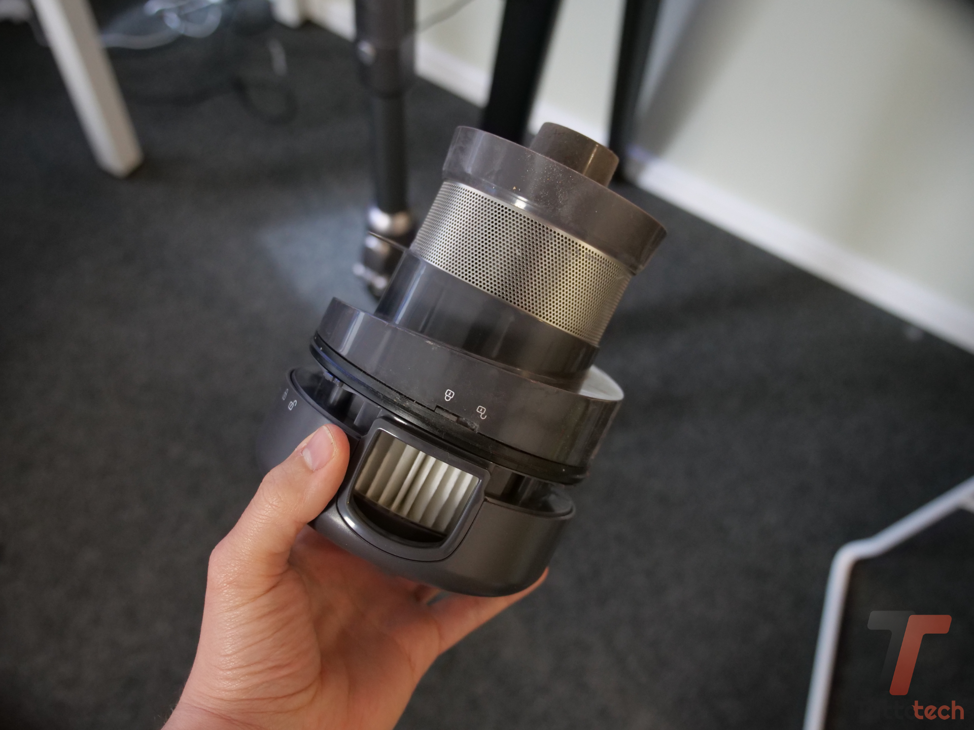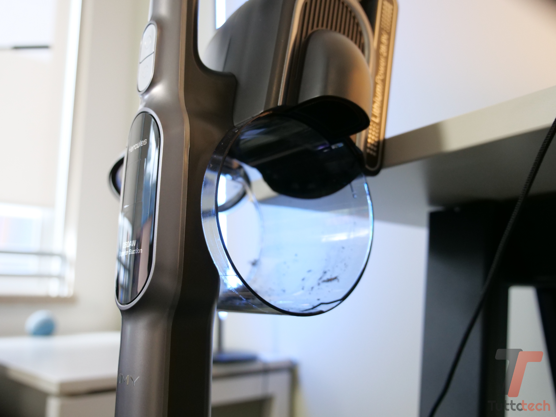 Il merito va anche al sistema Horizontal Cyclone, che riduce le curve nel percorso dell’aria e garantisce una filtrazione più efficiente, oltre a mantenere costante la potenza durante tutta la sessione. Il contenitore da 0,6 litri è ben proporzionato e lo svuotamento one-click evita contatti con lo sporco, proteggendo mani e allergie. Il serbatoio poi è completamente rimovibile per poter effettuare una pulizia profonda ogni mese.