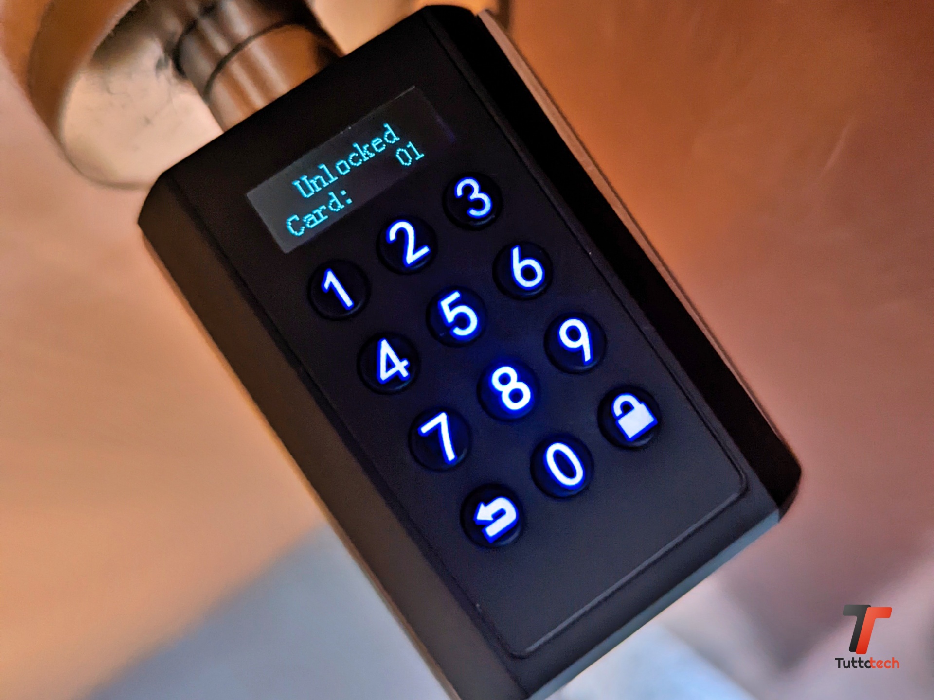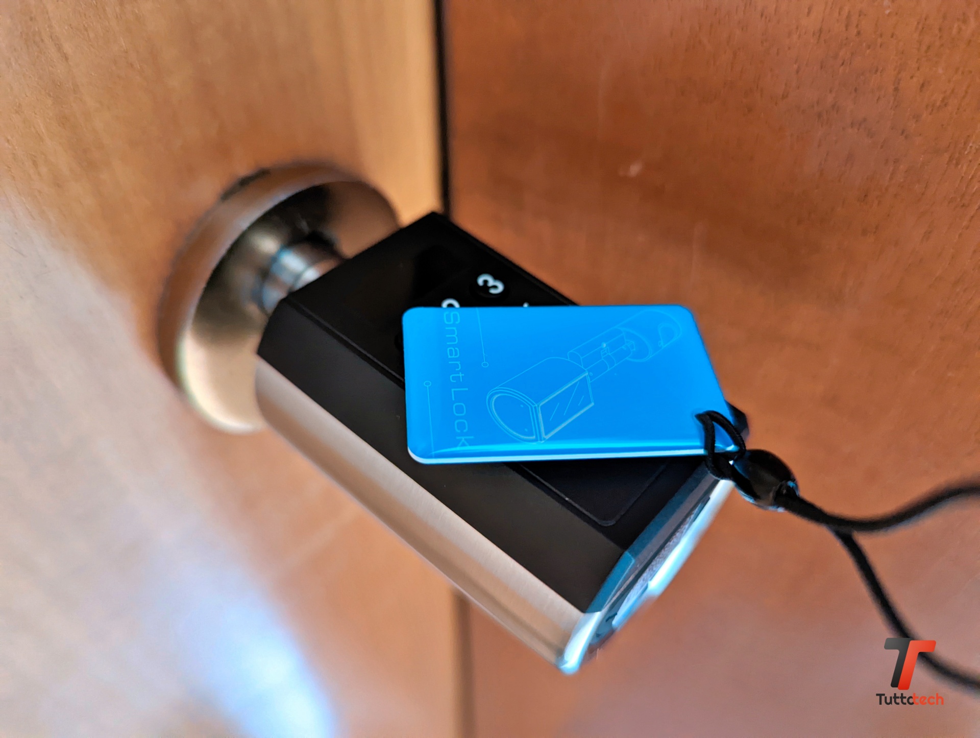 Una volta inserito il codice numerico è sufficiente premere il simbolo a forma di lucchetto per aprire la porta, mentre passando un tag NFC l’apertura è automatica. Nella confezione di vendita sono presenti tre tag da appendere al portachiavi, comodi e semplici da registrare e affidare a un familiare. È indubbiamente il metodo più indicato per chi ha poca confidenza con la tecnologia e non vuole avere problemi.