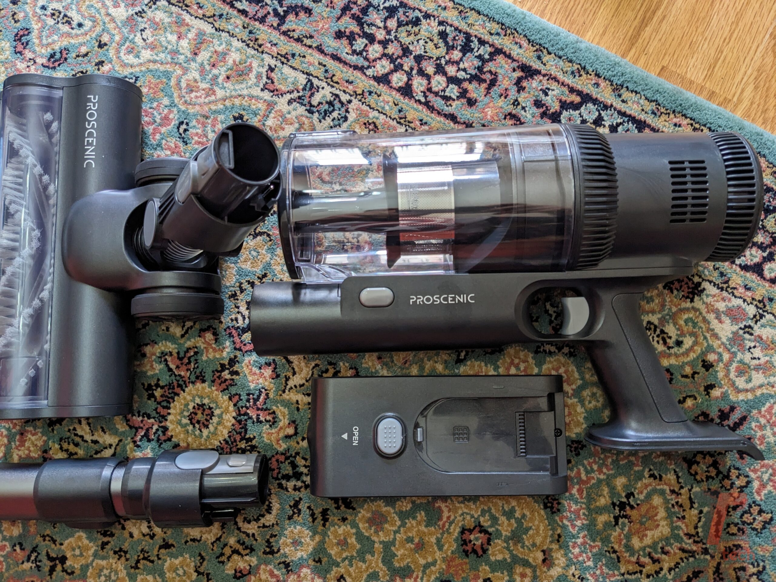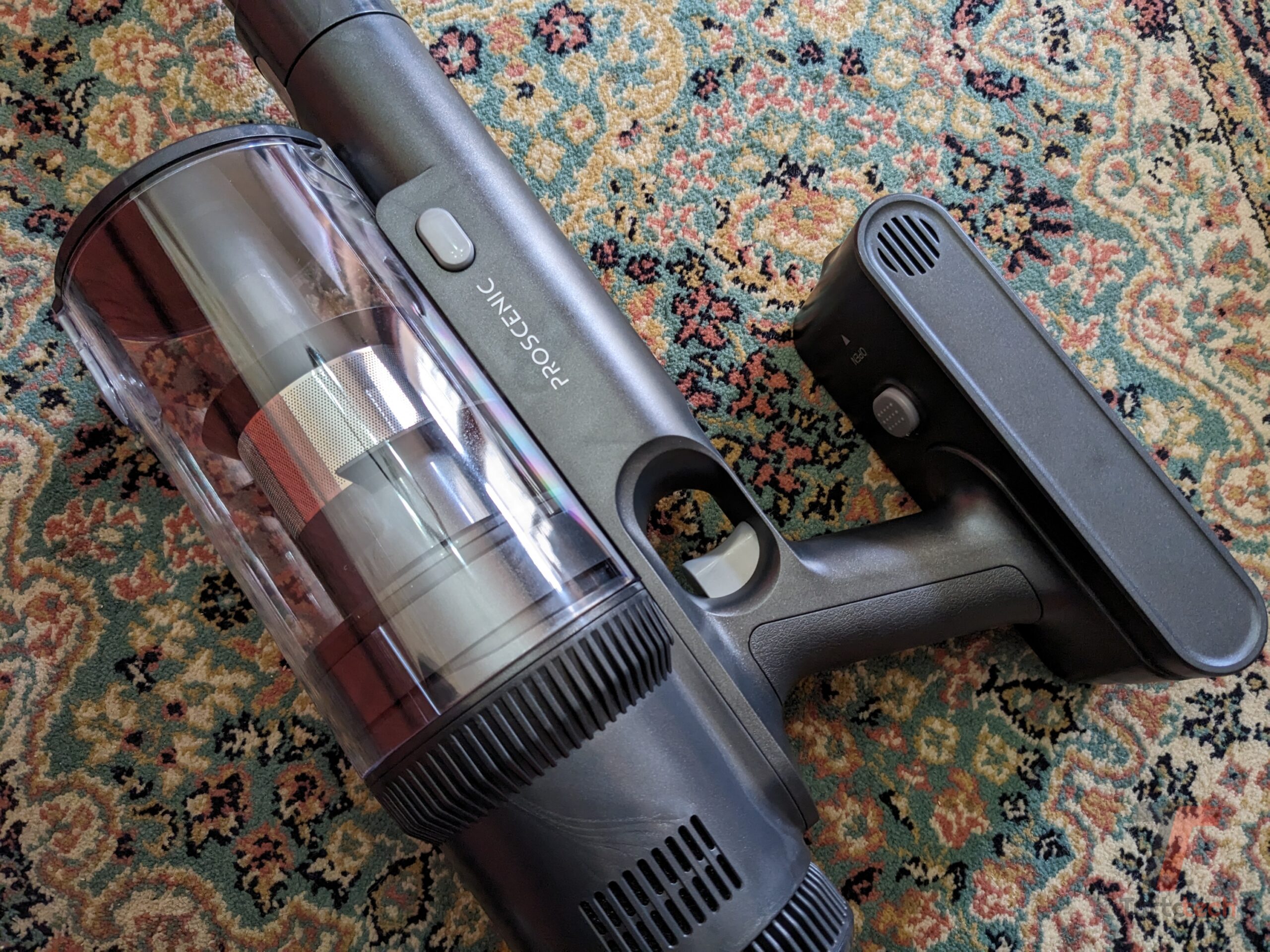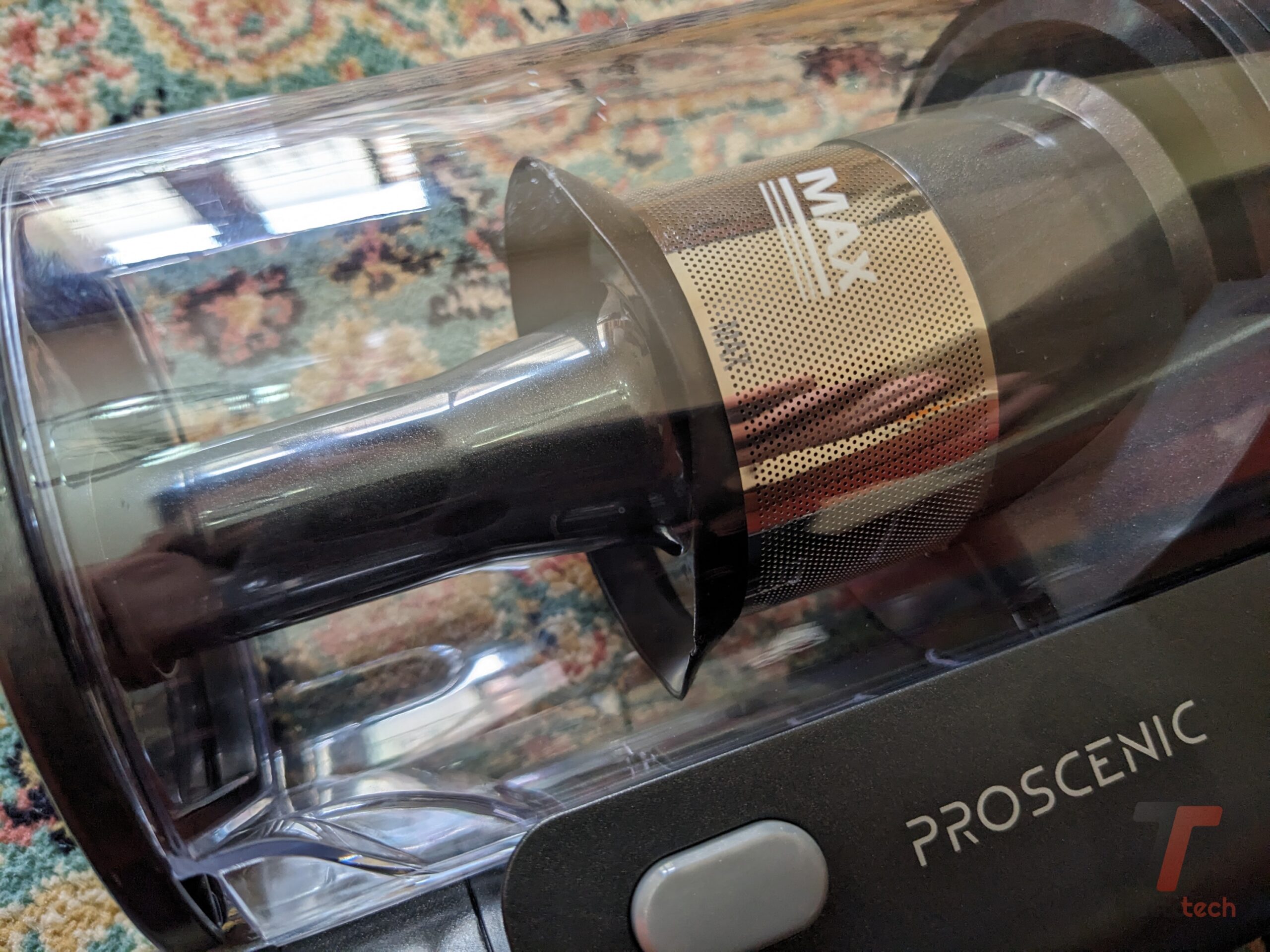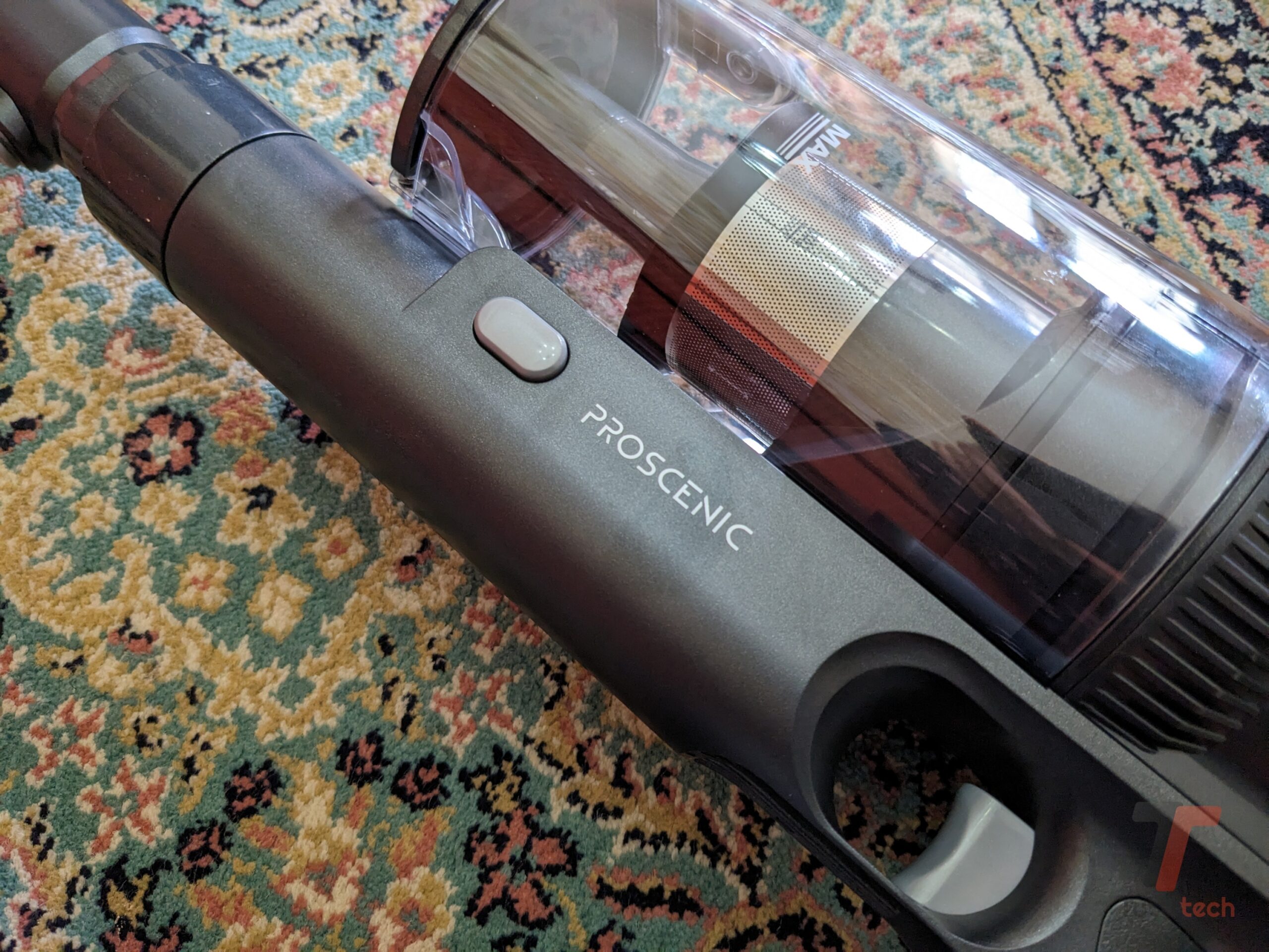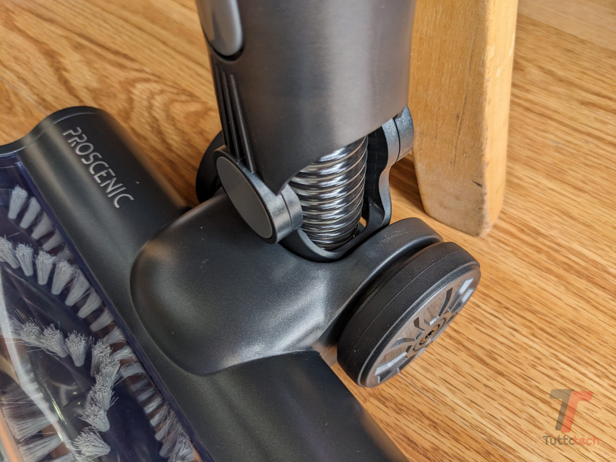 Dopo tutto questo e una volta avuta davanti la scopa montata, la cosa che ha colpito è stata la robustezza e la qualità con cui tutti i pezzi erano incastrati fra loro: infatti, la plastica di cui è realizzata è di buona qualità, i pezzi sono ben fatti e poi l’assemblaggio è preciso al punto giusto, tanto che una volta messi insieme tutti i pezzi la scopa risulta abbastanza solida e un sol blocco. Da questo punto di vista, un bel plauso a Proscenic perché è riuscita a realizzare un prodotto tutto sommato di buona qualità, per di più compatto e leggero, pur contenendone i costi.