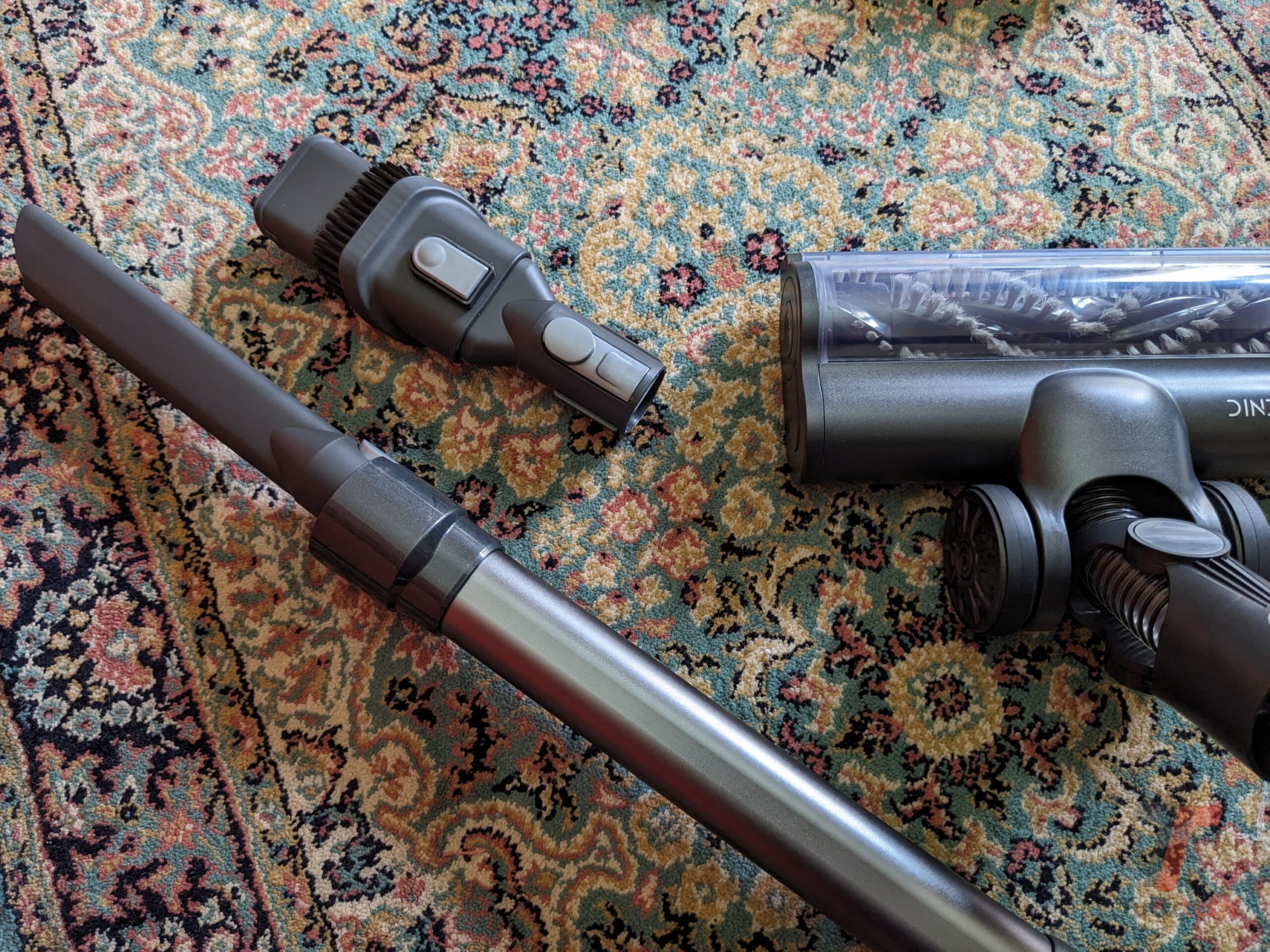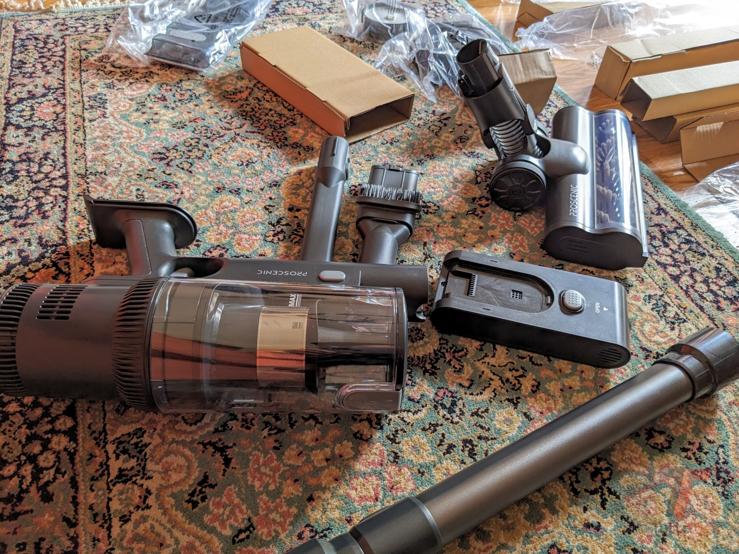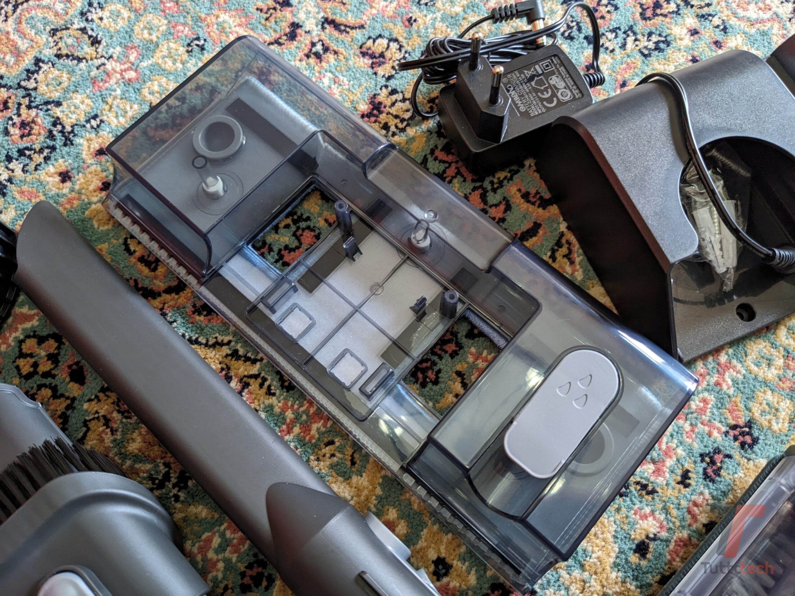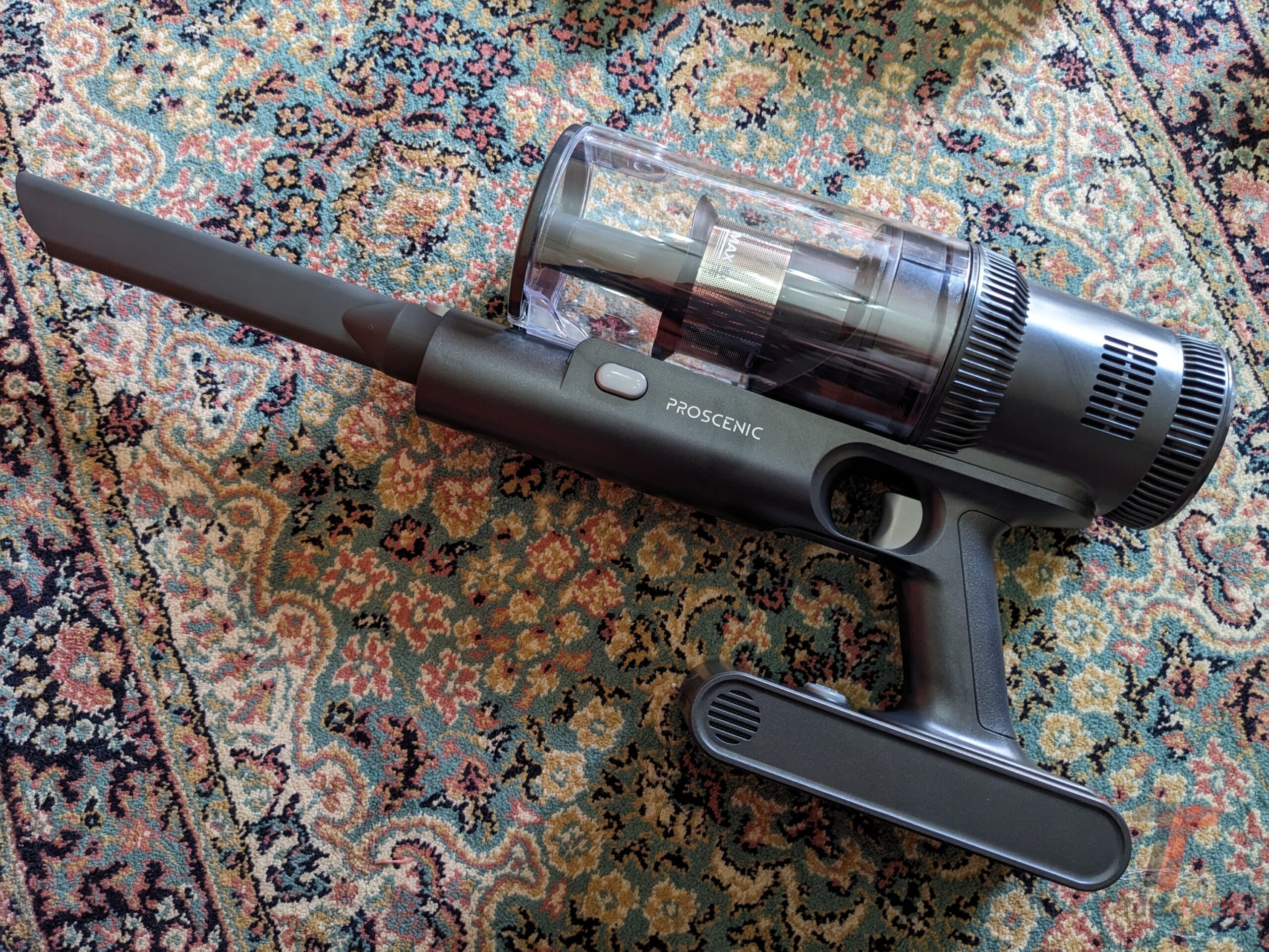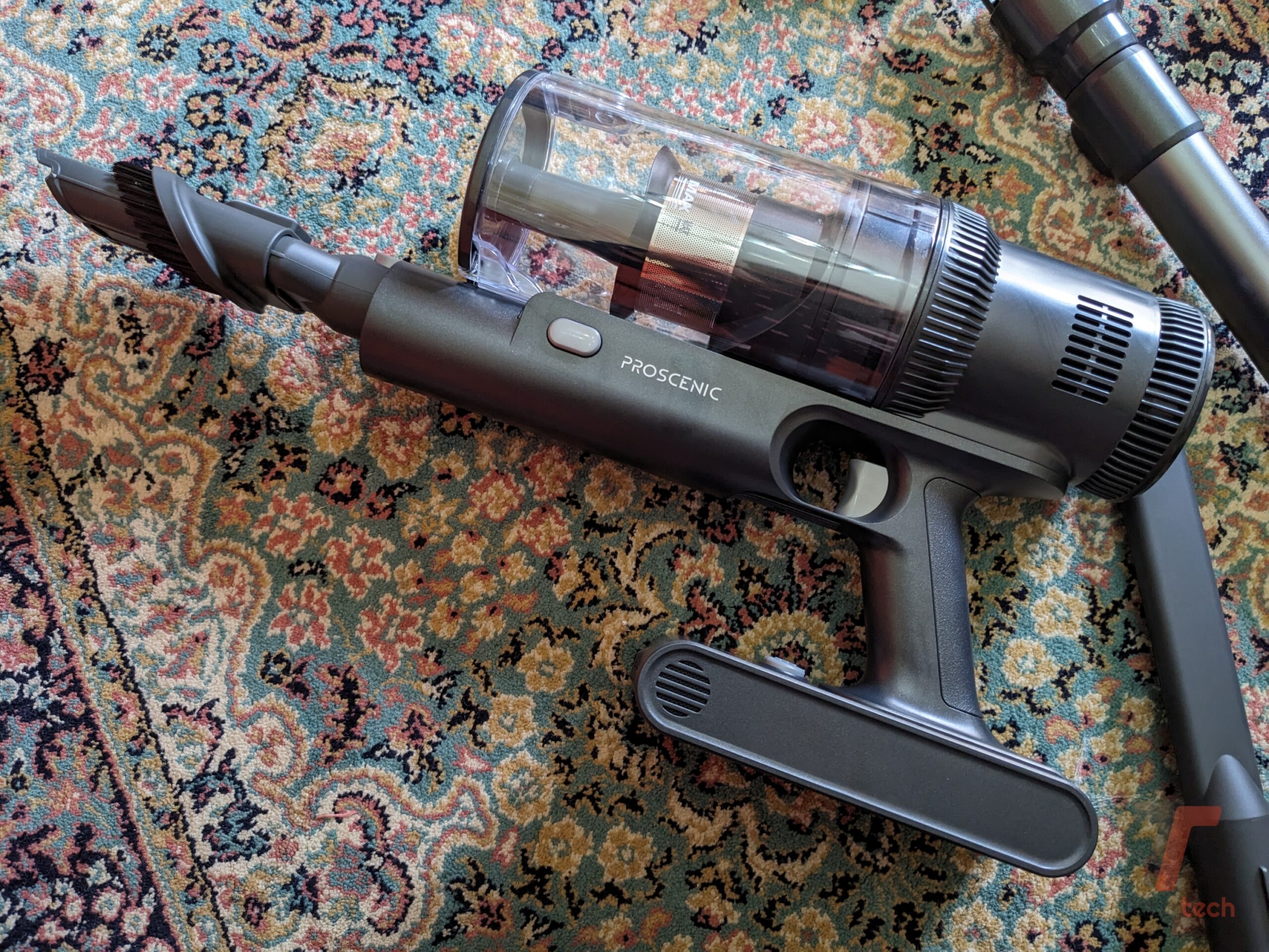 Dopo tutto questo e una volta avuta davanti la scopa montata, la cosa che ha colpito è stata la robustezza e la qualità con cui tutti i pezzi erano incastrati fra loro: infatti, la plastica di cui è realizzata è di buona qualità, i pezzi sono ben fatti e poi l’assemblaggio è preciso al punto giusto, tanto che una volta messi insieme tutti i pezzi la scopa risulta abbastanza solida e un sol blocco. Da questo punto di vista, un bel plauso a Proscenic perché è riuscita a realizzare un prodotto tutto sommato di buona qualità, per di più compatto e leggero, pur contenendone i costi.