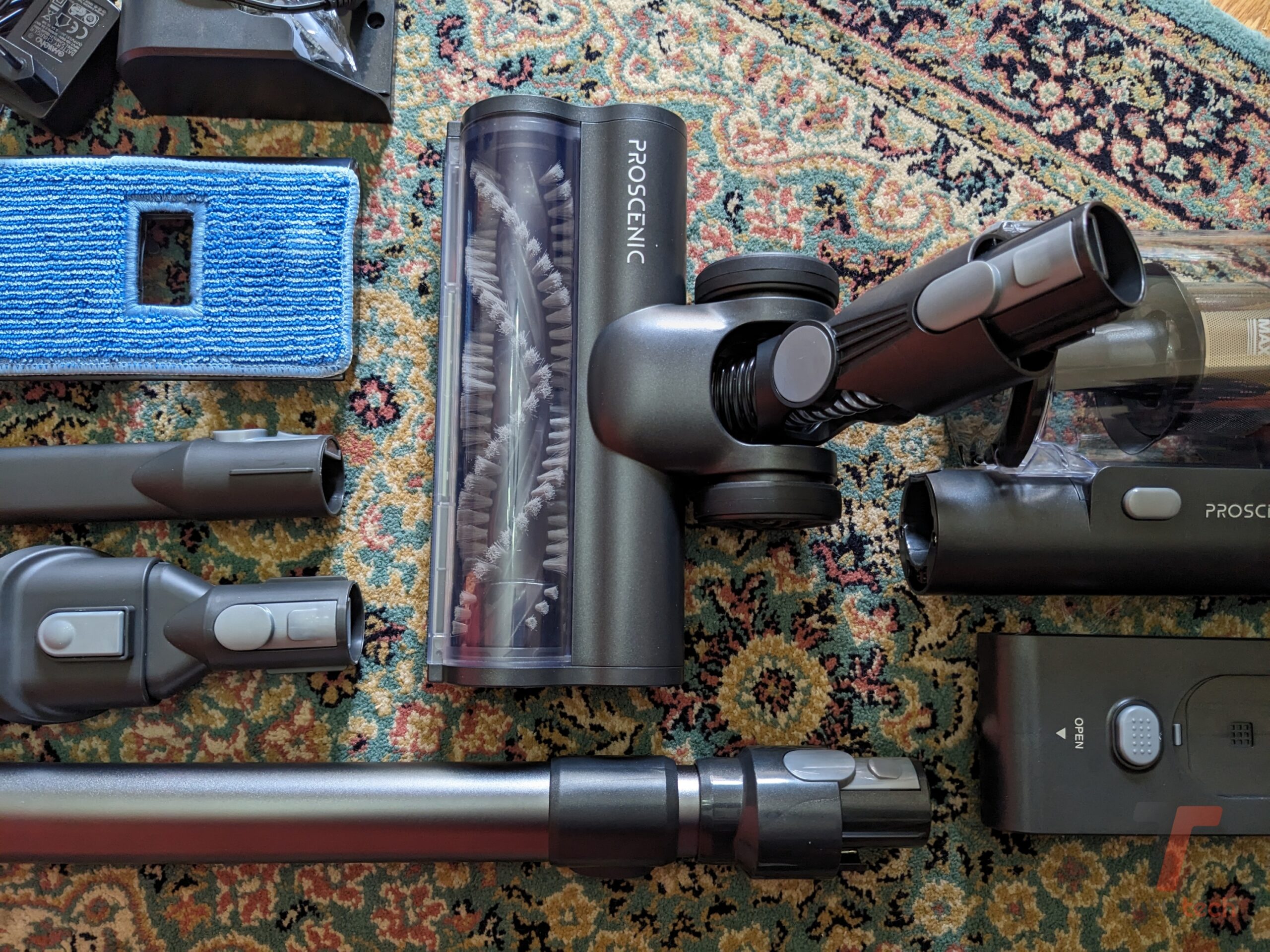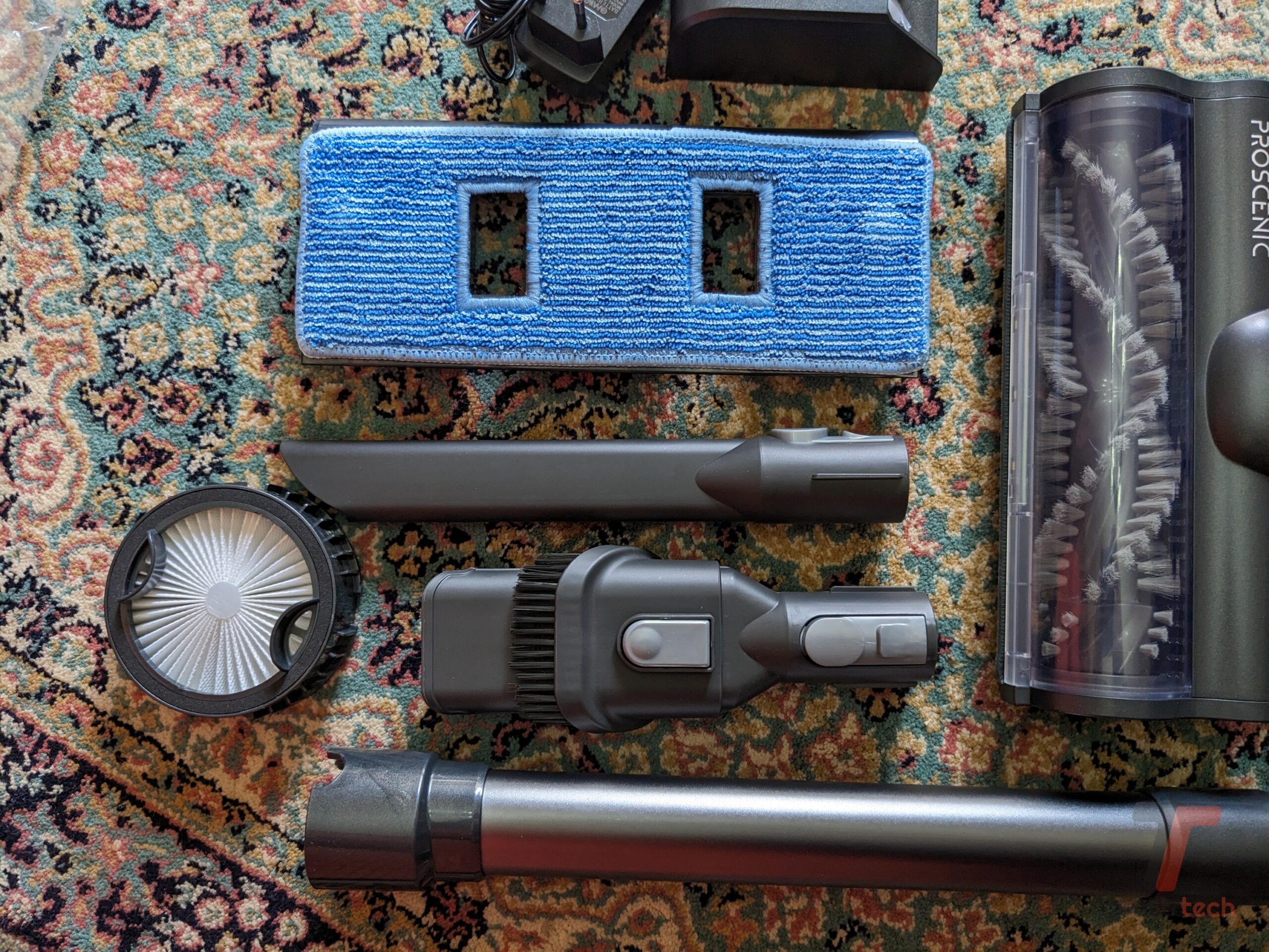 Prima di andare avanti c’è bisogno di parlare un attimo di un suo accessorio con il quale può lavare anche i pavimenti: sì, perché lei non è solo una scopa aspirapolvere ma è anche una lavapavimenti, seppur definirla così sia un gran complimento. Almeno in teoria è una lavapavimenti, eh, perché poi nella pratica lava poco e niente e il motivo è molto semplice: non integra un rullo rotante, magari a pressione, con una vaschetta dedicata per l’acqua pulita e l’acqua sporca, ma integra solo un accessorio con una piccola vaschetta da 340 ml per l’acqua pulita con un panno attaccato sotto che struscia sul pavimento mentre si muove la scopa. È in sostanza il funzionamento che sfruttavano i primi robot lavapavimenti e che ormai quasi non si vede più, se non su prodotti economici, perché è del tutto inutile in quanto non rimuove alcuna macchia; per essere più precisi, alla fine si stratta di uno straccio inumidito che strofina in modo delicato sul pavimento ed è facile intuire che un sistema del genere non può lavare un pavimento. A ogni modo, c’è e può far comodo magari per avere una possibilità in più per, per esempio, levare la polvere dal pavimento o asciugare del liquido versato a terra; scordatevi però di usare Proscenic P11 Mopping per lavare, inteso come pulire, il pavimento perché non ci riuscirete.