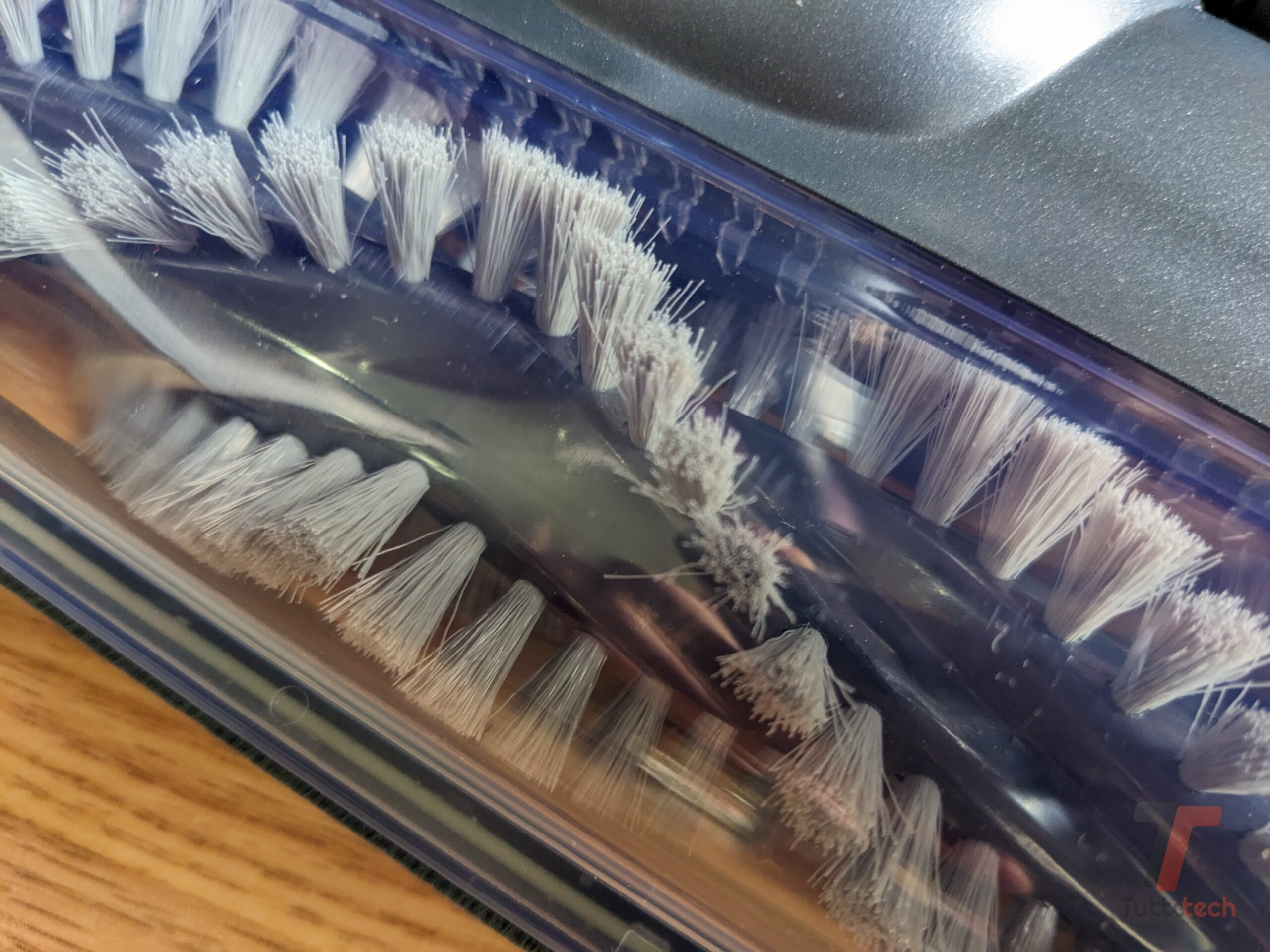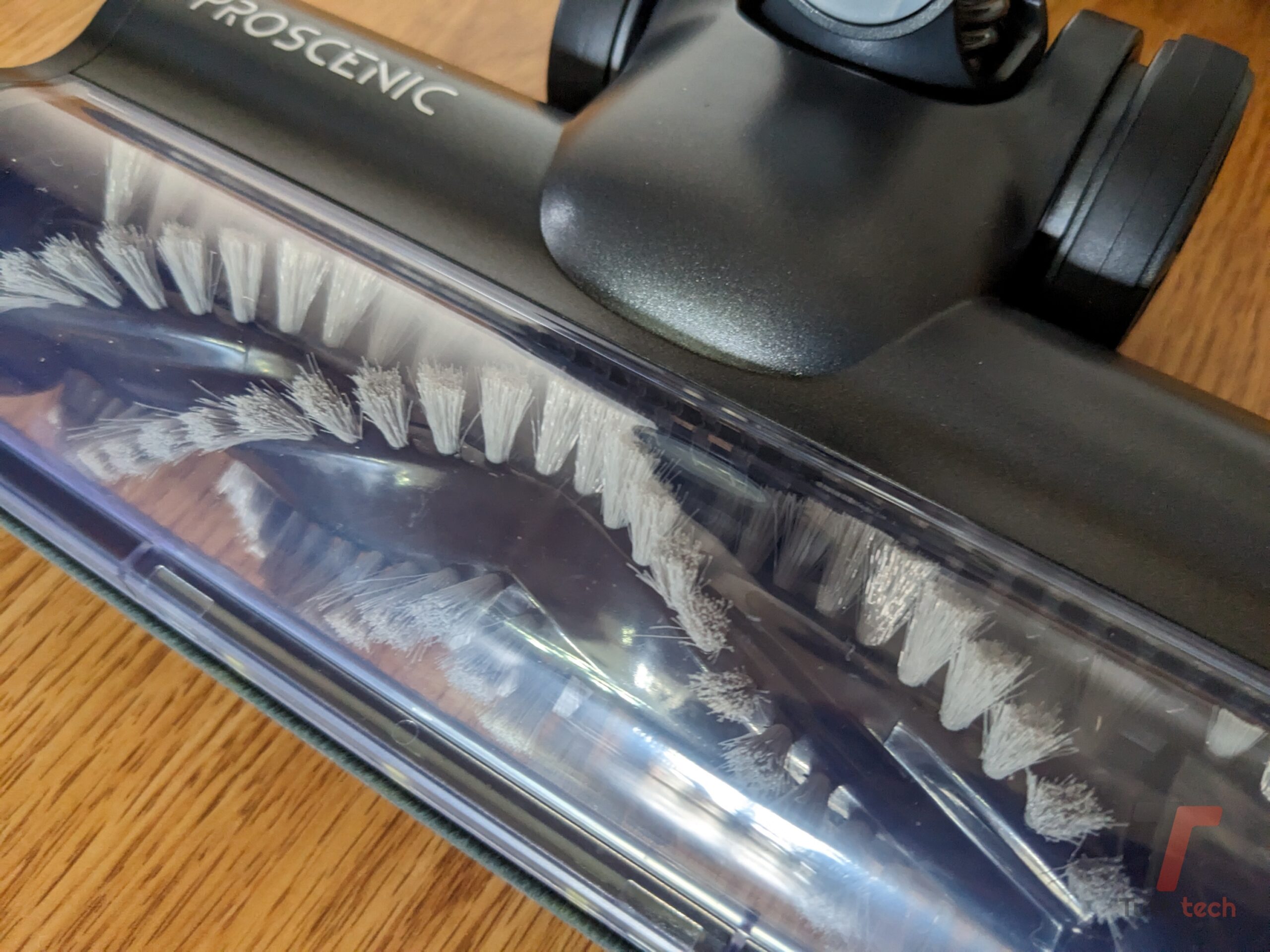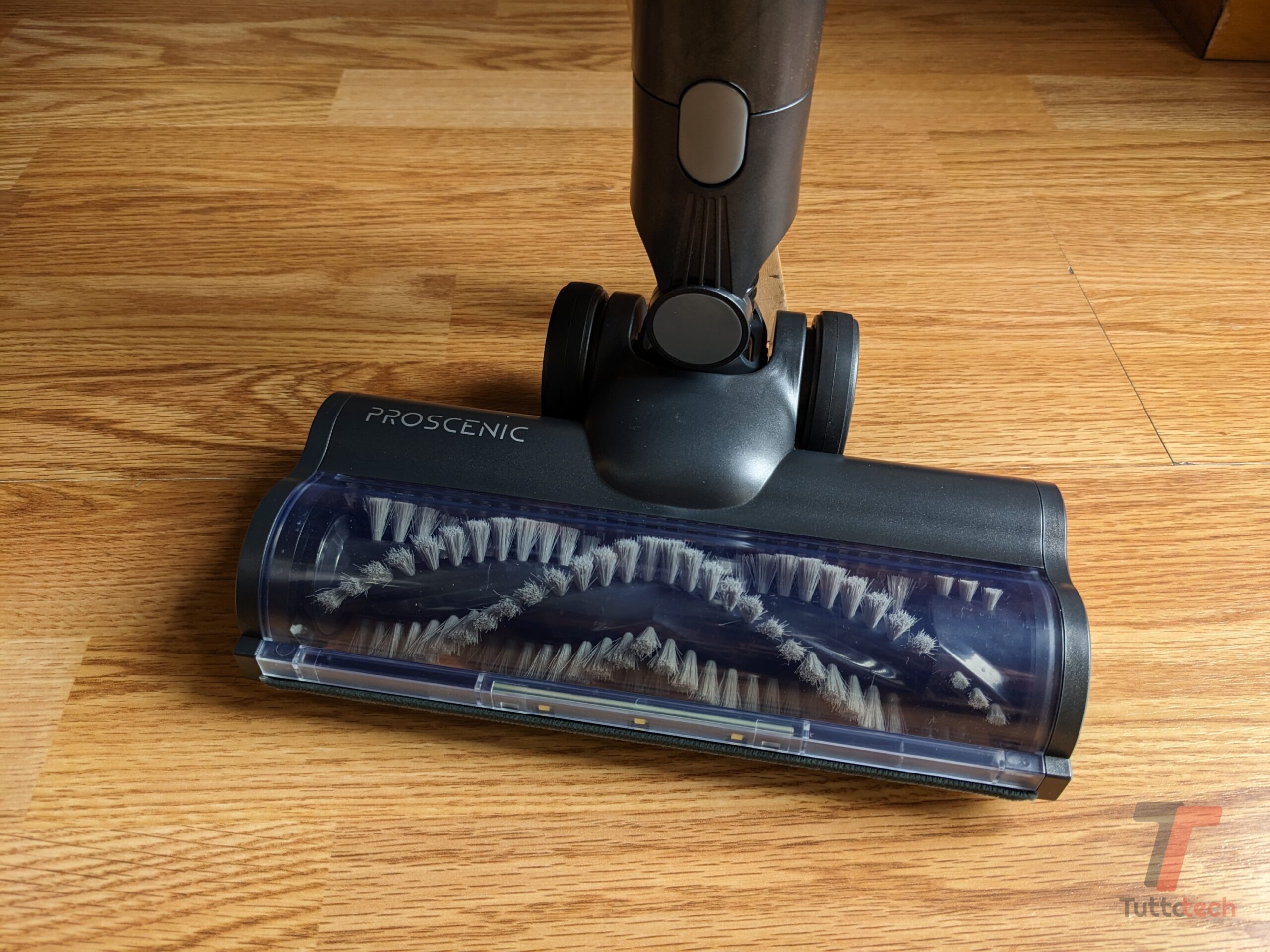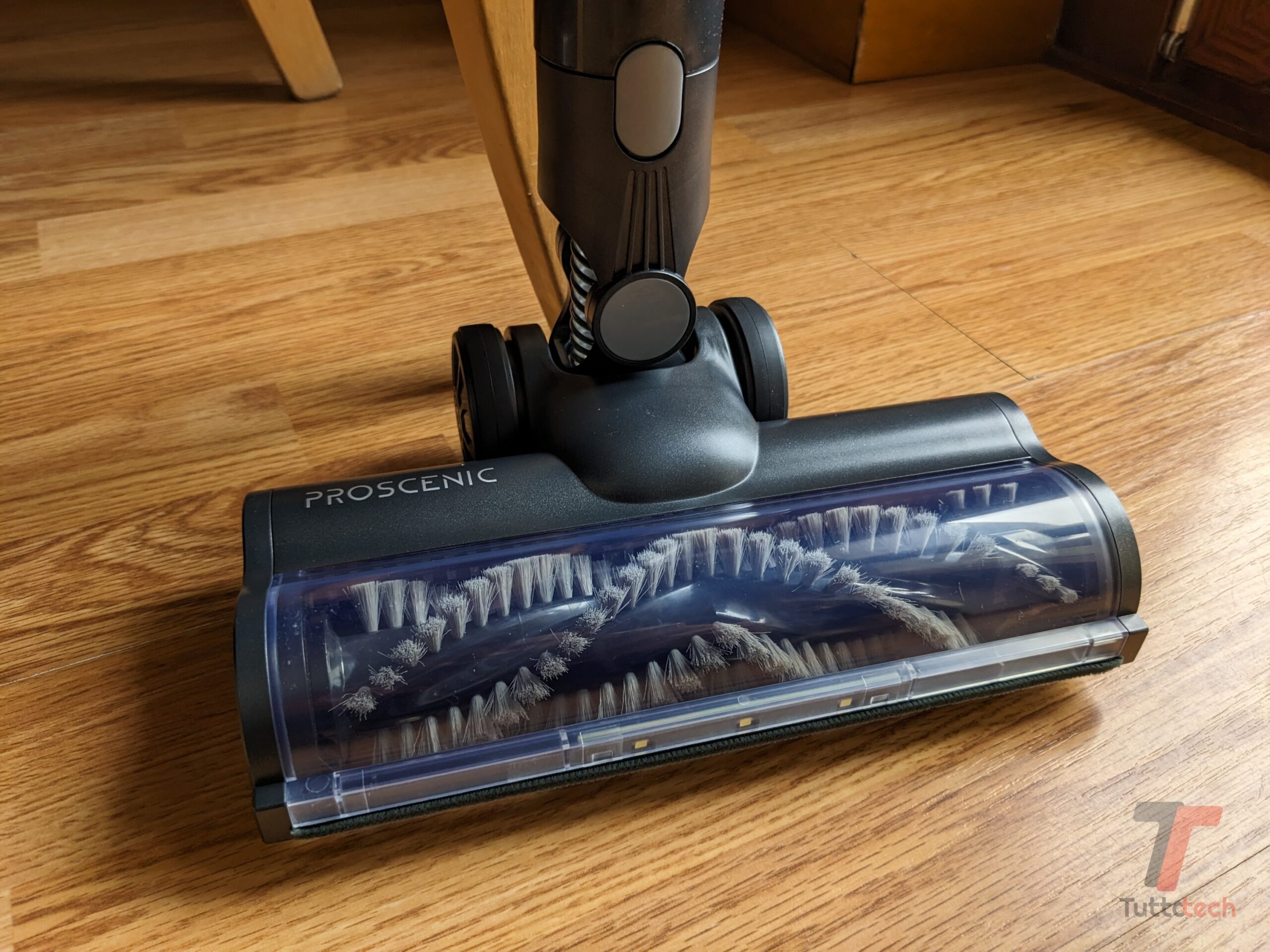 Anche da questo punto di vista funziona molto bene perché la scopa aspira in modo impeccabile e con efficacia grazie alla grande potenza del motore, è snodata di 90° in verticale e 180° in orizzontale per raggiungere anche gli spazi più angusti, è accompagnata da dei luminosissimi LED frontali che illuminano anche i granellini di polvere e la spazzola rotante al suo interno è studiata per ridurre al minimo i grovigli, come quelli che si formano con i capelli, e per rimuovere facilmente eventuali corpi estranei al suo interno. Dobbiamo anche sottolineare che il sistema di filtri per la purificazione dell’aria funziona sul serio perché una volta espulsa sa di pulito e di freschezza, come se fosse più leggera, e che Proscenic P11 Mopping è relativamente silenziosa: relativamente perché è una scopa elettrica, per di più con un motore molto potente, e quindi un qualche tipo di rumore deve emetterlo per forza, soprattutto alla modalità massima di aspirazione che sfrutta tutti e 400 i Watt a disposizione, però non è fra le più rumorose che ci siano passate fra le mani ed è comunque un rumore sopportabile. Come quasi tutti i prodotti di questa categoria, anche Proscenic P11 Mopping possiede una scopa con un perimetro in plastica intorno alla spazzola rotante molto spesso e questo fa sì che non aspiri dalla sua intera superficie; per esempio, anche perché ci è capitato, pensiamo di dover aspirare sporco ai piedi di un muro, in prossimità di un battiscopa: ebbene, è impossibile, almeno senza allontanare lo sporco da aspirare dal muro.