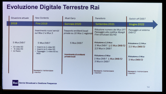 - Fase 4: da Giugno 2022 si spegnerà il DVB-T per passare alle trasmissioni DVB-T2 e HEVC. La Rai potrà offrire 14 canali in HD e uno in 4K