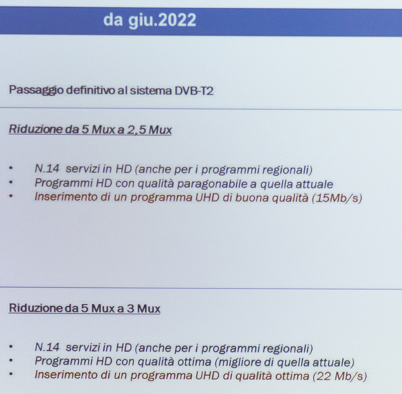 - Fase 3: da Settembre 2021 si inizia con la dismissione dell’MPEG2 e in contemporanea la diminuzione dei Mux. Con il passaggio alla codifica MPEG4 tutti i canali SD/HD verranno automaticamente eliminati in favore delle controparti HD, inutile avere entrambi gli standard qualitativi per singolo canale