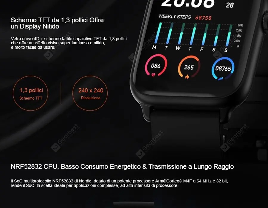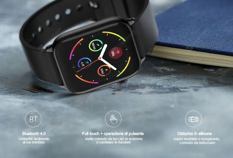 Lo schermo a colori è di tipo full touch e permette di visualizzare rapidamente le misurazioni effettuate. Tali dati possono essere analizzati anche sul proprio smartphone, tramite la companion app che permette di impostare allarmi e promemoria. La certificazione IP 68 vi permette di utilizzarlo anche in piscina e non manca la possibilità di ricevere notifiche dallo smartphone.
