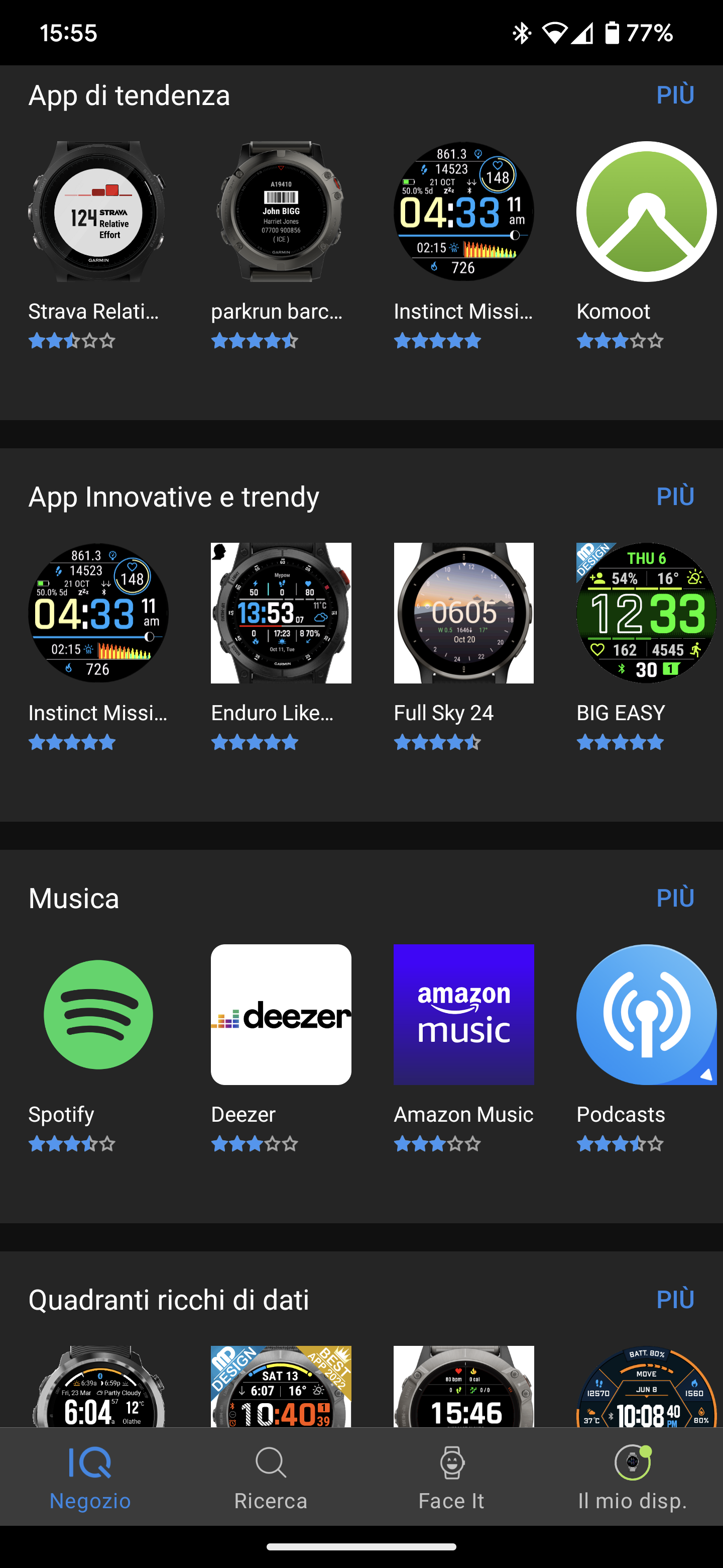 Per arricchire Garmin Forerunner 955 e Venu 2 Plus c’è poi il citato Connect IQ Store, una specie di Google Play Store o App Store in cui trovare di tutto. Si va dai campi dati da aggiungere ai propri sport preferiti ai quadranti, fino ad arrivare alle app, a pagamento e non, con cui rendere più completi i dispositivi. Si tratta di un valore aggiunto importante, che può rendere uno smartwatch meno completo come Venu 2 Plus quasi alla pari di altri in alcuni frangenti.