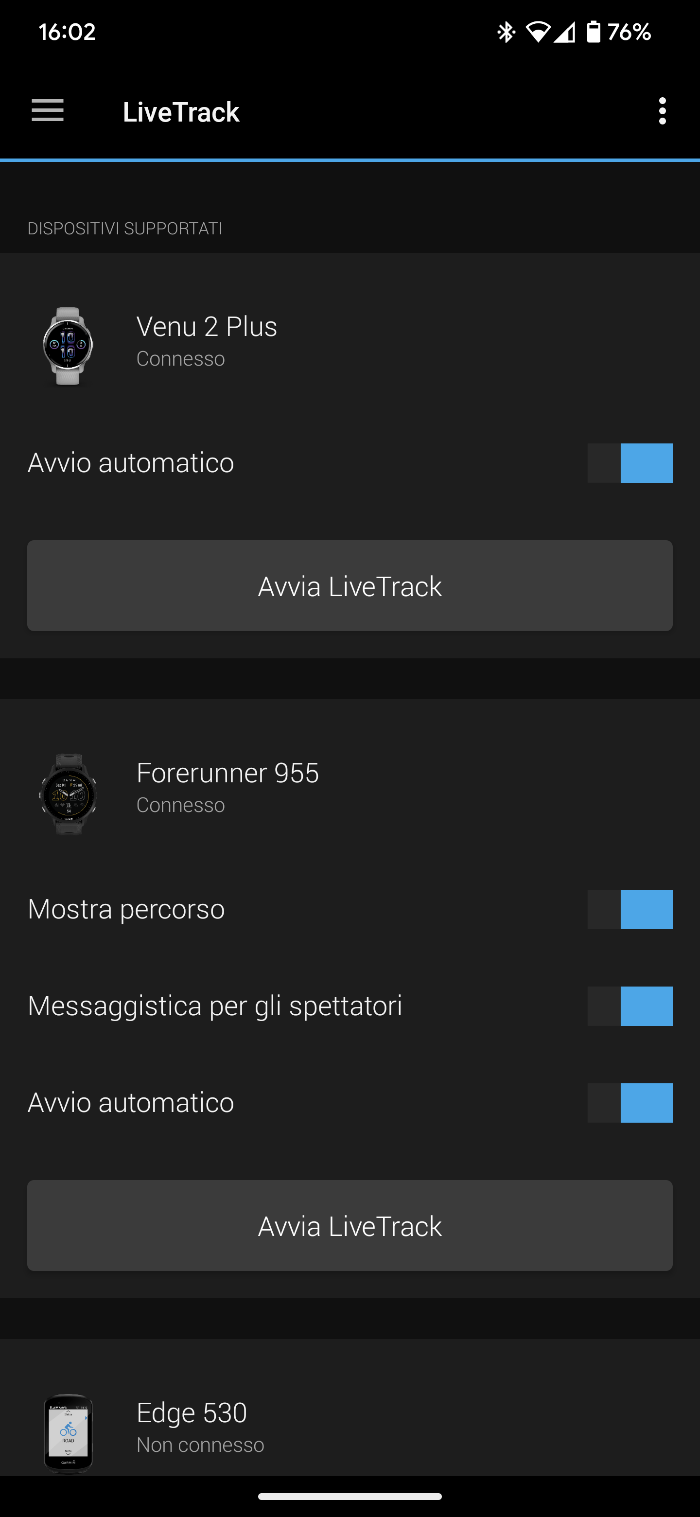 Un’altra funzione molto utile è il LiveTrack, che su Forerunner 955 è più completo (in più permette di mostrare il percorso e la funzione di messaggistica per gli spettatori). Praticamente consente ai contatti impostati di seguire gli spostamenti in tempo reale dell’utente, un’utilità specie per chi si allena in solitaria in montagna, o in luoghi remoti. In caso di problemi, il Forerunner riserva tuttavia una scorciatoia con la quale, tenendo premuto il pulsante “Light” per 3 secondi invia automaticamente una richiesta d’aiuto ai propri contatti. Chiaro, per tutto questo serve una connessione Bluetooth e la copertura della rete cellulare.