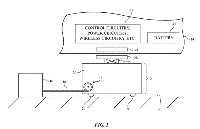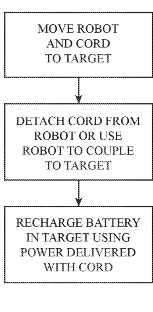 Ed ecco che si arriva alla parte interessante: “Il dispositivo di ricarica può accoppiare un cavo di alimentazione al dispositivo di destinazione, può accoppiare un connettore nel dispositivo di ricarica al dispositivo di destinazione o può utilizzare un elemento di trasferimento di energia wireless come un’antenna a bobina per trasferire energia in modalità wireless al dispositivo di destinazione. I sensori possono essere utilizzati per facilitare l’allineamento tra il dispositivo di ricarica e il dispositivo target. I sensori possono anche essere utilizzati per rilevare dinamicamente ed evitare oggetti estranei nel percorso del dispositivo di ricarica. “