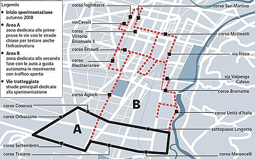 Per via della disposizione molto particolare delle vie di Torino, alquanto differenti dai blocchi quadrati delle principali città americane, le auto a guida autonoma inizialmente circoleranno solo di notte e scortate dai vigili e solo quando i test porteranno i risultati sperati ci si sposterà verso situazioni più realistiche.