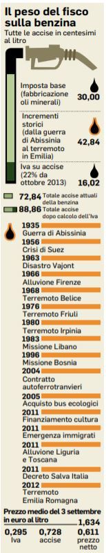 Come potete vedere, è dal 1935 che il costo della benzina si appesantisce sempre più con l’aggiunta di accise su accise. La cosa paradossale è che, nonostante le accise sono pensate in primo luogo per aiutare a sostenere il costo di un qualcosa nel breve periodo, stiamo ancora continuando a pagare le accise di 80 anni fa.