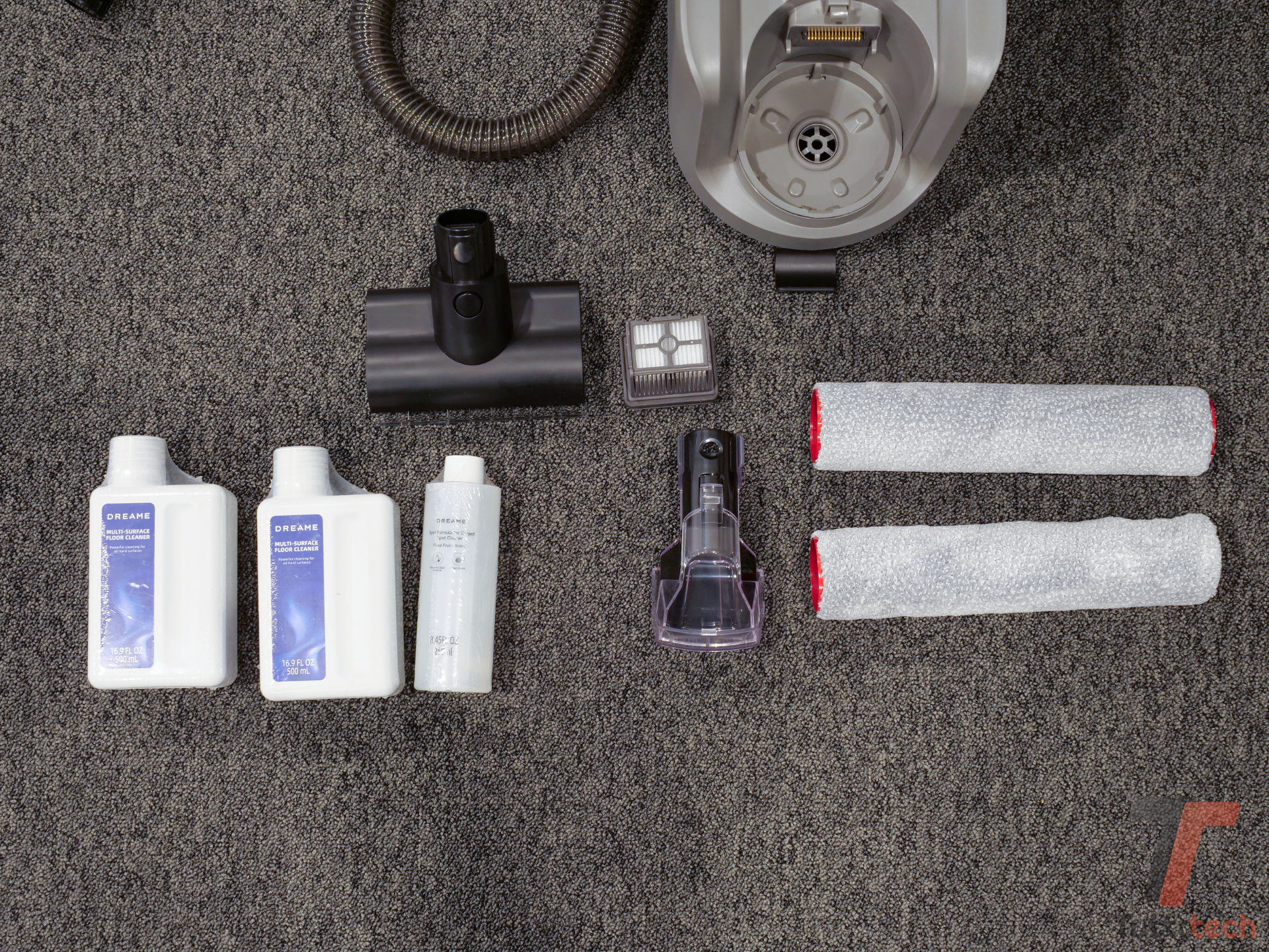 Per pulire divani, materassi e superfici in alto ci sono la mini-spazzola motorizzata per materassi e tessuti, efficace su acari e peli, e due accessori flessibili dedicati: Deep Reach, che arriva in profondità tra cuscini, sedili e fessure strette, e Daily Reach, più orientato alla manutenzione quotidiana di angoli, cornici di finestre e punti alti; una prolunga per superfici rigide aiuta a trattare con delicatezza scrivanie, tastiere e monitor, mentre il pulitore portatile per tappeti con tubo da 1,5 metri completa il quadro per i tessili più impegnativi, e nella confezione trovano spazio anche una spazzola a rullo di ricambio, un filtro aspirapolvere di ricambio, una piccola spazzola per la manutenzione, 2–3 bottiglie di soluzione detergente a seconda della versione regionale e un supporto porta accessori removibile che si aggancia alla base e tiene in ordine l’intero corredo, con manuale multilingue e certificati di garanzia che chiudono il pacchetto e fanno percepire l’insieme come un vero kit completo più che come un singolo elettrodomestico con qualche extra.