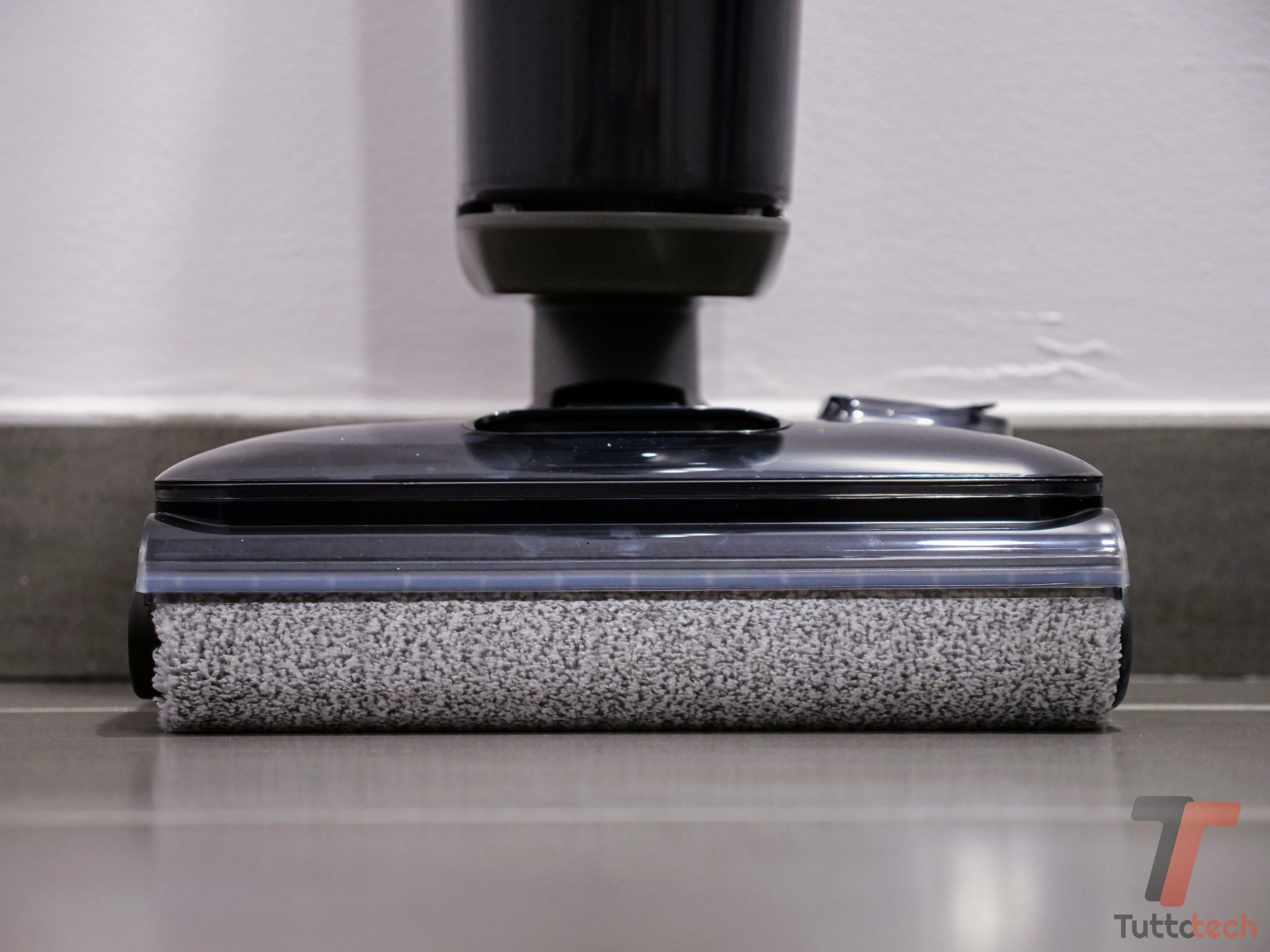 Durante i test, abbiamo notato che, come molte lavapavimenti a rullo, se si incontrano detriti solidi di dimensioni maggiori durante una manovra in retromarcia, tende a spingerli anziché aspirarli. Questo piccolo difetto si mitiga facilmente eseguendo un secondo passaggio in avanti o procedendo con un’andatura più moderata.