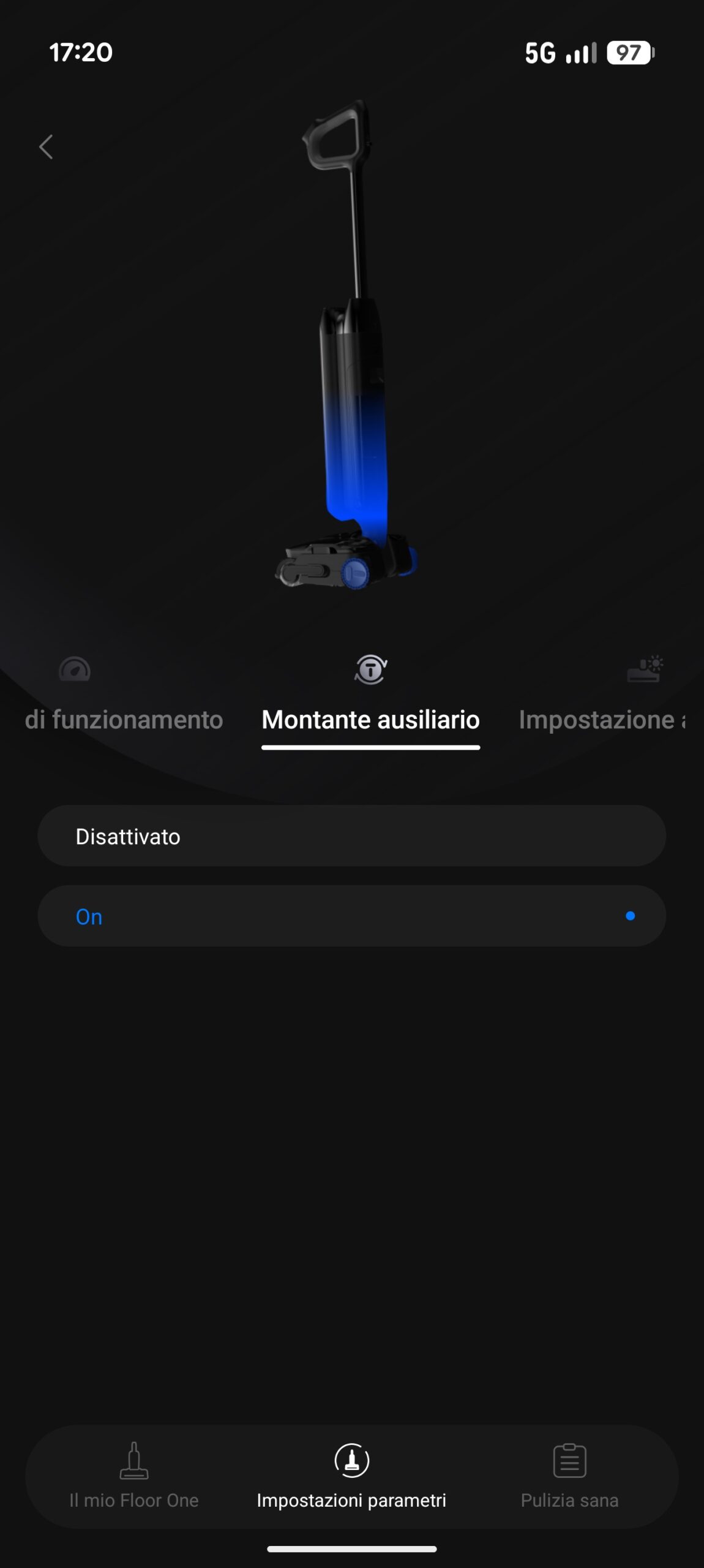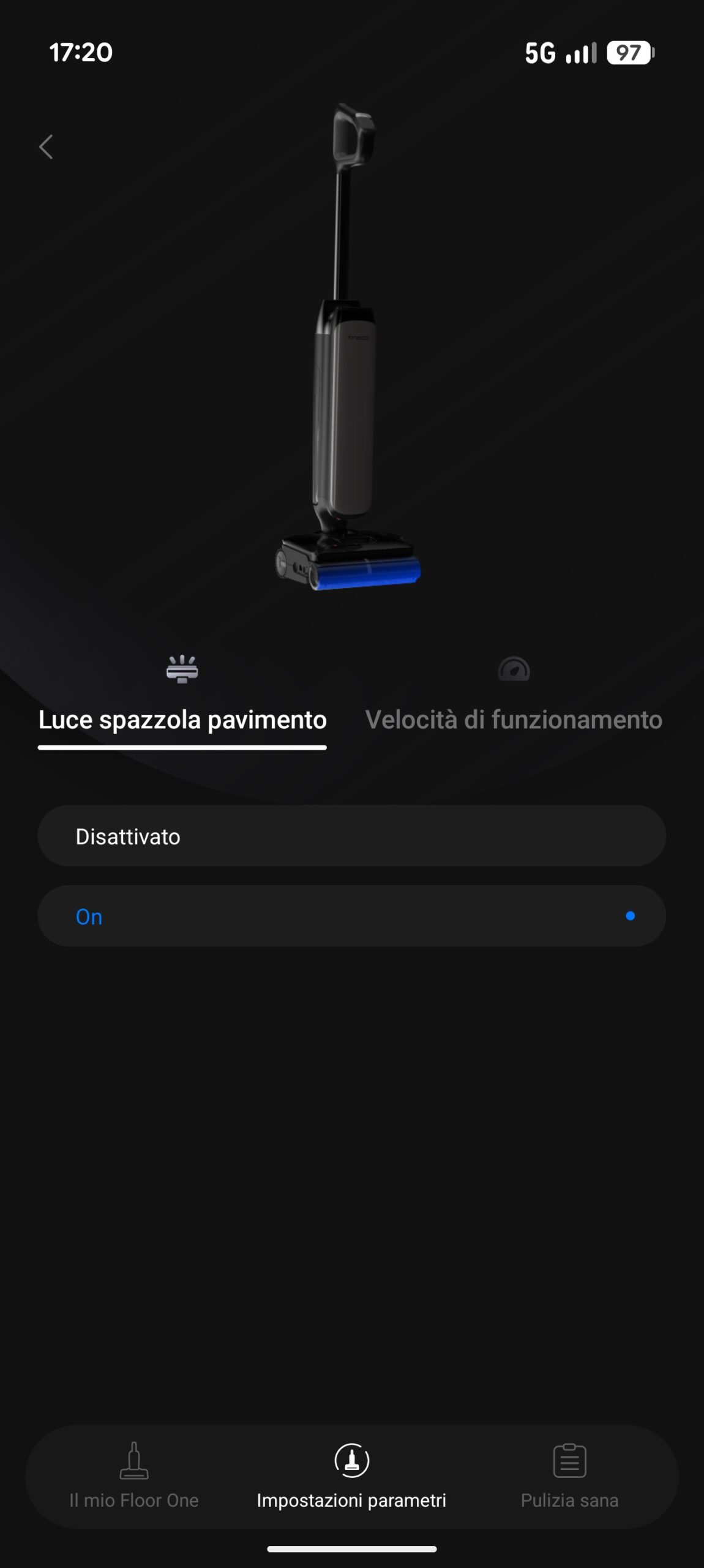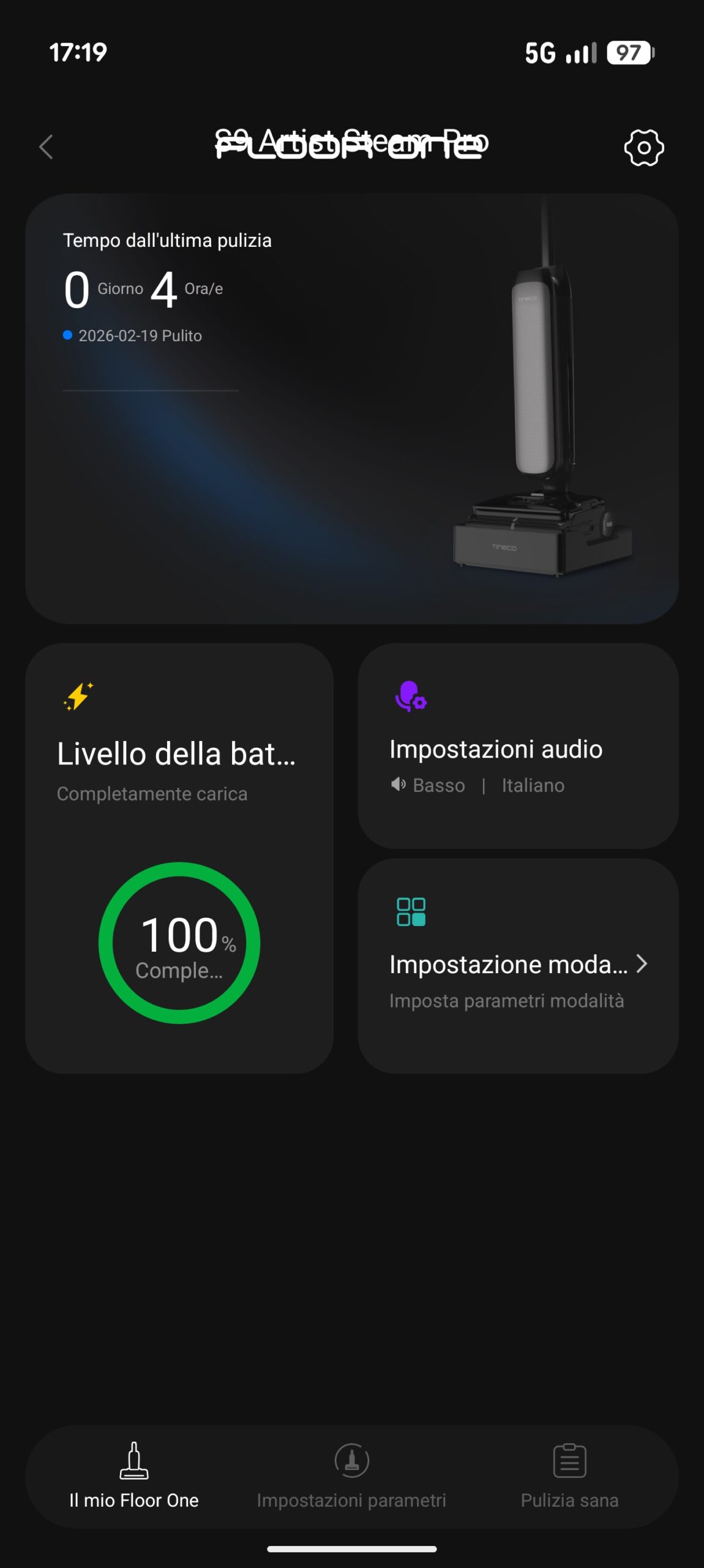 La macchina si collega alla rete Wi-Fi domestica sulla banda 2,4 GHz e comunica con l’app Tineco, disponibile per iOS e Android, che rappresenta il centro di controllo per tutto ciò che non si gestisce direttamente dal manico. Dall’app si regolano i livelli di flusso e le preferenze di modalità, si creano profili di pulizia personalizzati (come quello a erogazione minima per il parquet di cui abbiamo parlato) e si ricevono notifiche sullo stato dei componenti, dall’usura del rullo ai promemoria di sostituzione filtri. Gli aggiornamenti firmware arrivano sempre attraverso l’app e si completano in pochi minuti senza interrompere il funzionamento della base. Per chi preferisce tenere lo sguardo sul pavimento piuttosto che sullo smartphone, il display LCD 3D a bordo della macchina mostra in tempo reale il livello di sporco rilevato dall’anello iLoop (rosso per sporco, blu per pulito), l’autonomia residua e la modalità selezionata, risultando leggibile anche in condizioni di luce intensa. A queste informazioni visive si aggiunge l’assistente vocale integrato, configurabile in più lingue tramite app, che segnala il livello di carica, la modalità attiva e gli eventuali errori con messaggi brevi e non invasivi.