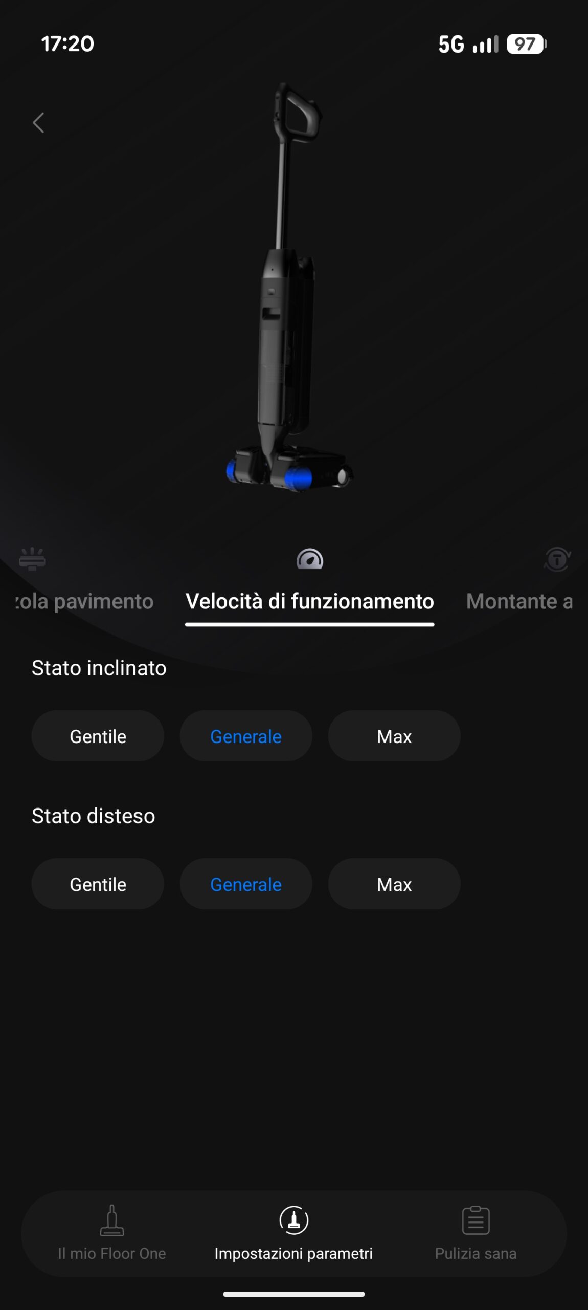 Lungo i bordi e negli angoli a 90° la macchina lascia inevitabilmente una striscia di pavimento scoperta, con polvere sottile e residui che richiedono un passaggio manuale o un panno; la barra LED frontale aiuta a individuare queste zone, rendendole evidenti anche in controluce. Spostandoci invece dalle geometrie al dosaggio dell’acqua, il discorso cambia: su parquet e pavimenti che temono l’umidità prolungata, come quelli con giunzioni non sigillate o finitura a olio, la scelta più sicura è la modalità Quiet, che riduce il flusso d’acqua e il rumore di fondo mantenendo lo sfregamento intensivo del rullo. Chi vuole spingersi ancora oltre può creare una modalità personalizzata dall’app, portando l’erogazione d’acqua sul rullo al livello minimo e ottenendo un dosaggio ancora più conservativo, ideale per le essenze più delicate. Su superfici dure meno sensibili, come gres o pietra sigillata, la modalità Auto offre invece un buon compromesso perché il sensore iLoop adegua il flusso allo sporco rilevato, rilasciando più acqua solo dove serve davvero. La scia, in entrambe le modalità, è risultata uniforme, senza striature o chiazze di bagnato disomogeneo, e questo riduce il rischio di aloni visibili una volta che la superficie si asciuga.