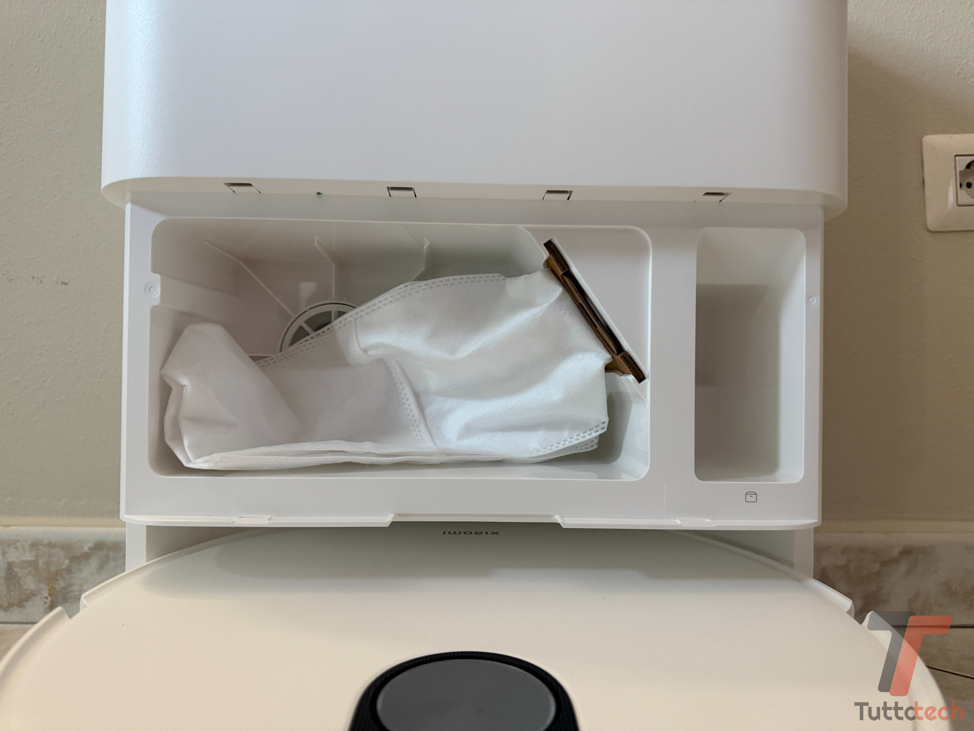 A fine ciclo, il robot rientra alla stazione di ricarica e pulizia, che non è solo una dock: l’unità (470 × 360 × 572 mm con rampa installata) integra due serbatoi da circa 4 litri ciascuno (acqua pulita e acqua sporca), una capacità sufficiente a coprire oltre 400 m² con un singolo riempimento. La base gestisce anche lo svuotamento automatico del contenitore polvere del robot, convogliando i residui in un sacchetto sigillato da 2,5 litri con autonomia dichiarata fino a 75 giorni, riducendo interventi e contatto diretto con lo sporco.