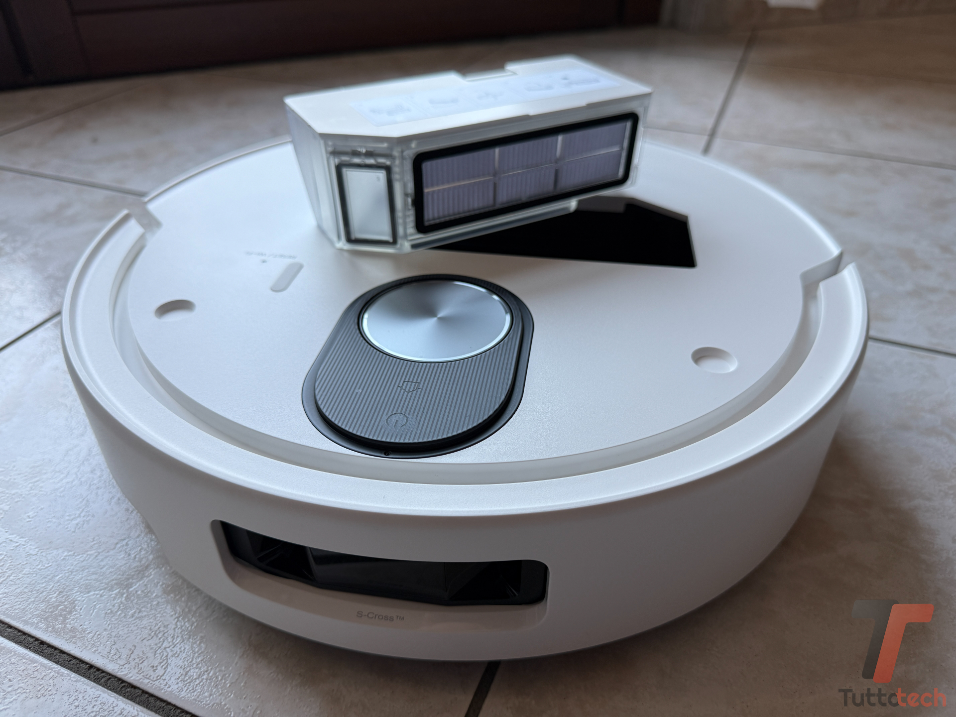 L’accesso al contenitore della polvere e filtro è diretto dal coperchio superiore, così la manutenzione è immediata; sul fronte operativo, il sistema di pulizia si affida al gruppo spazzole: la principale integra una tecnologia anti-groviglio per gestire capelli e peli di animali, affiancata da una spazzola laterale estensibile che sporge all’occorrenza per rifinire bordi e angoli a filo battiscopa. Il gruppo lavora in coppia con un’aspirazione dichiarata di 20.000 Pa, utile per rimuovere detriti fini e sporco più consistente sia su superfici dure sia su tappeti a pelo corto.