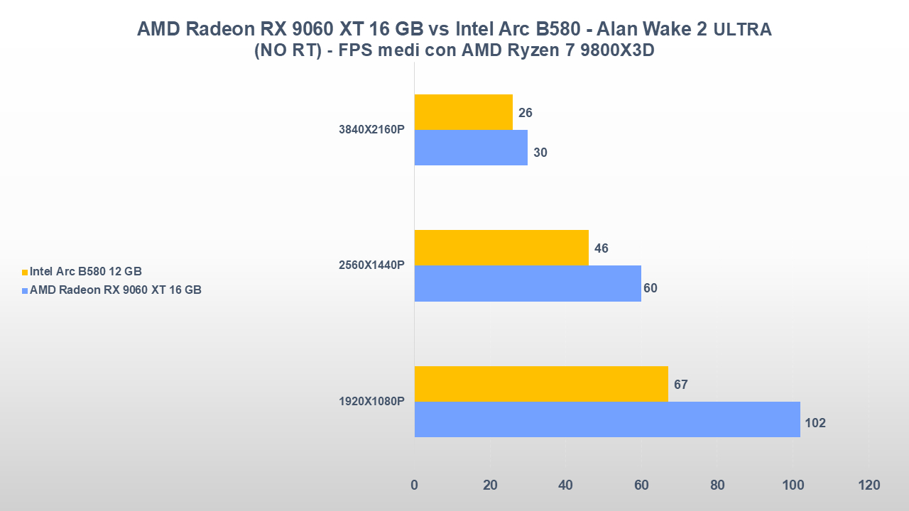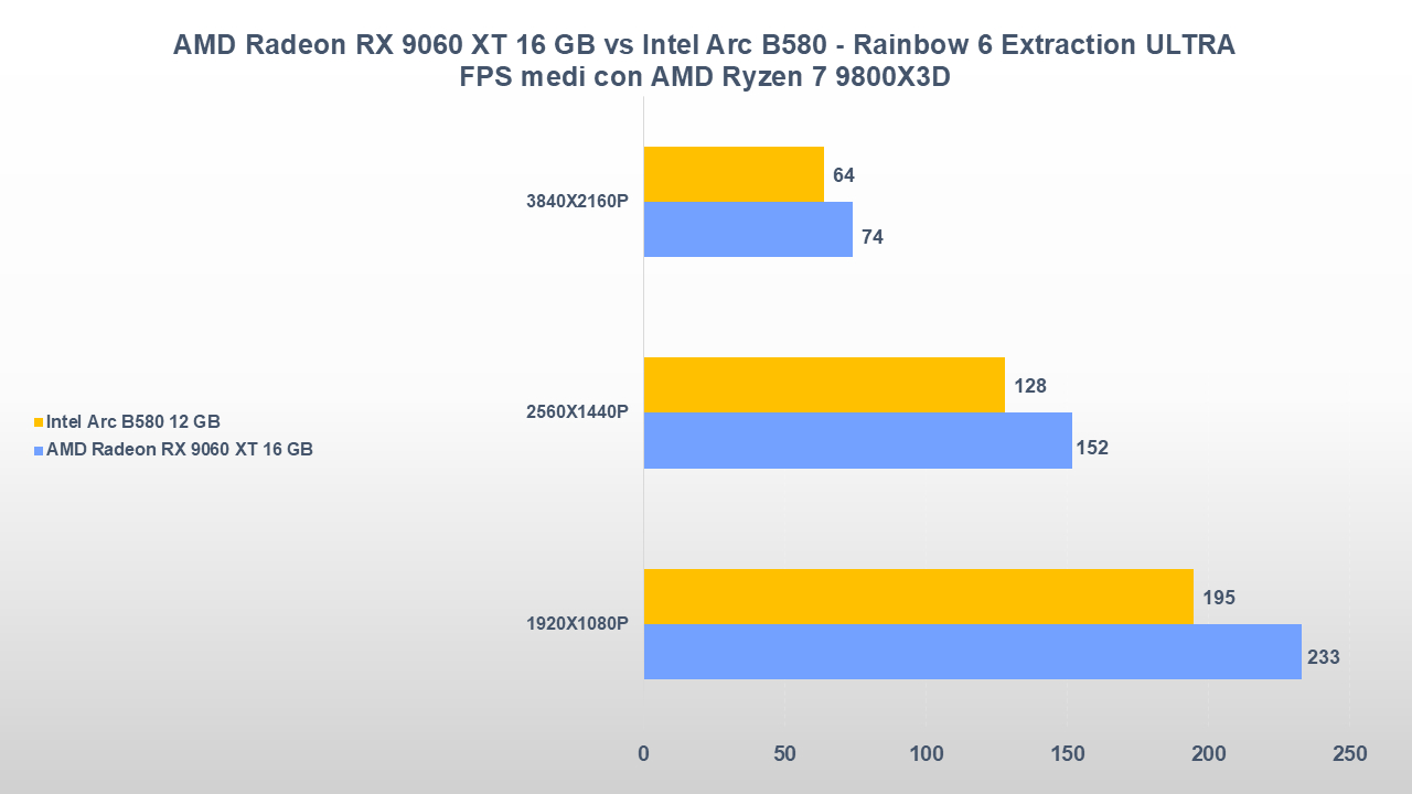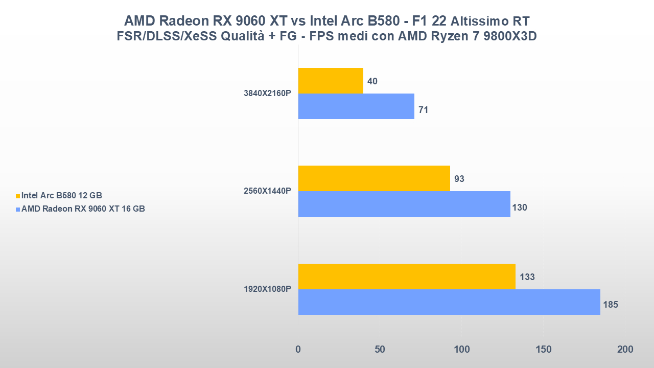 Se abilitiamo il ray-tracing invece, Arc B580 mostra il fianco e anche se Radeon RX 9060 XT 16 GB non è un mostro nei giochi che lo supportano, il divario sale di molto in tutte e tre le risoluzioni.