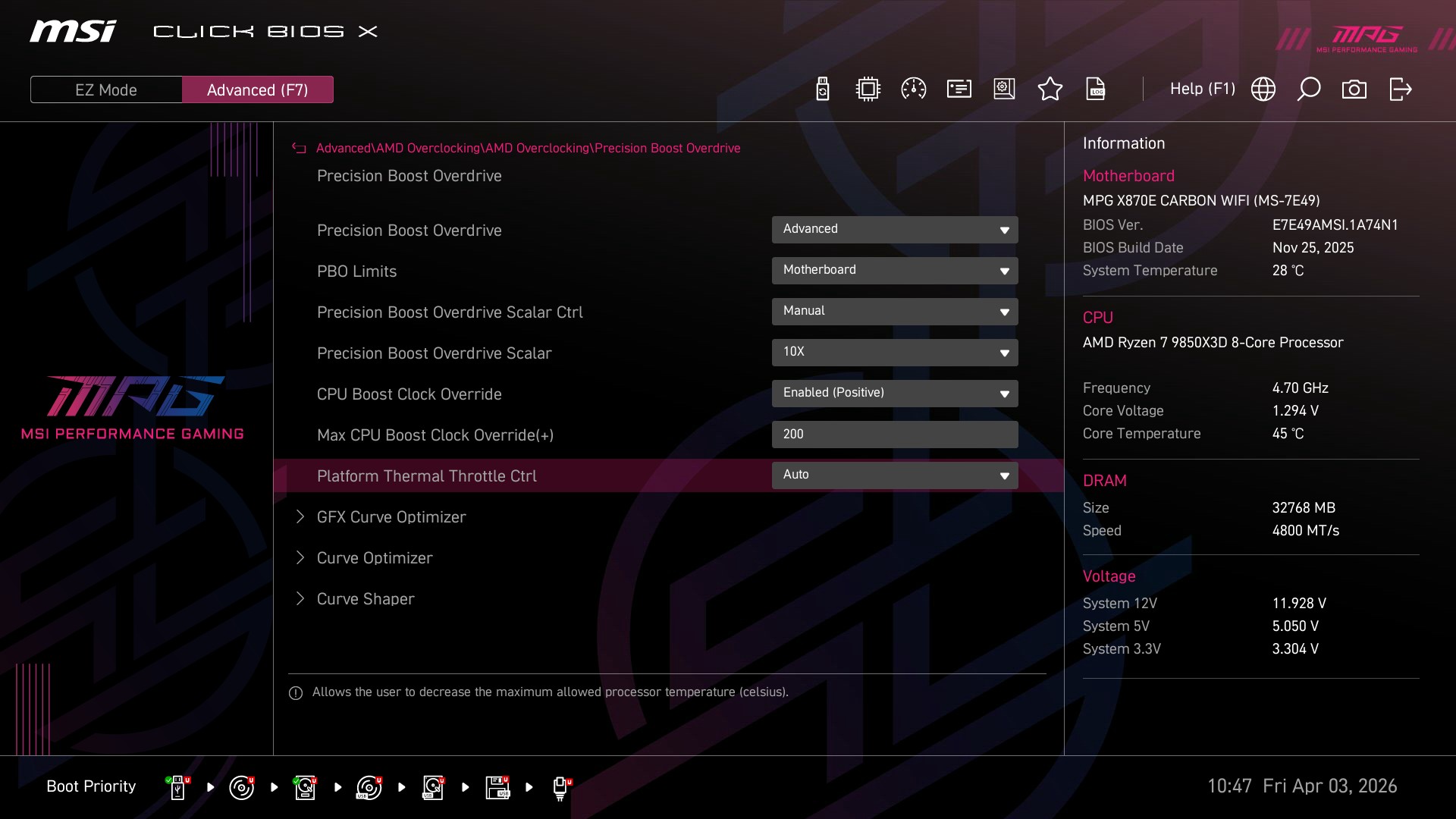 A seguire vi lasciamo le nostre impostazioni utilizzate nel menu PBO, considerando che abbiamo a disposizione una scheda madre MSI X870E Carbon WiFi con dissipatore a liquido AiO da 360 millimetri (la dissipazione è importantissima in questo ambito).