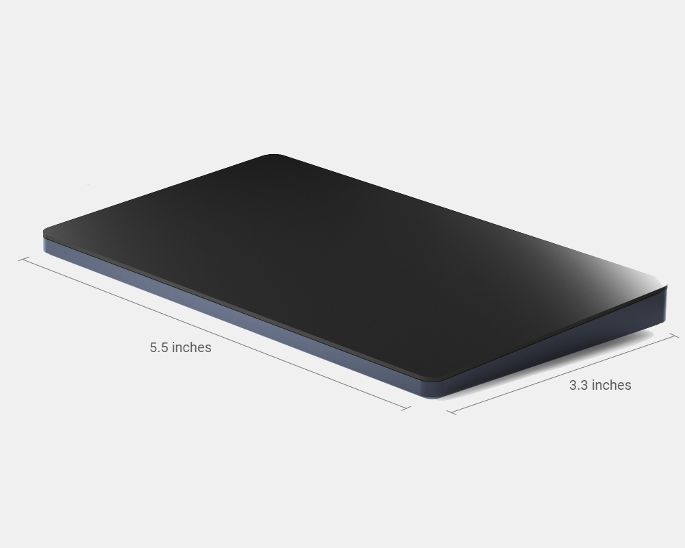 Mentre la scocca è in alluminio, la superficie è in vetro per una fluida scorrevolezza (come quello dei MacBook), con il supporto multi-touch per le gesture. È largo 14 centimetri e alto 8,3 centimetri, con le stesse connettività Bluetooth 4.2 e USB-C presenti.