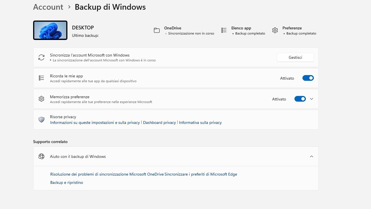 - Recarsi in Impostazioni/Account/Backup di Windows sul nuovo PC e verificare la sincronizzazione dell’account con Onedrive nonché il processo di backup per app e preferenze
